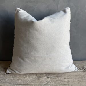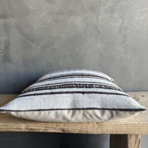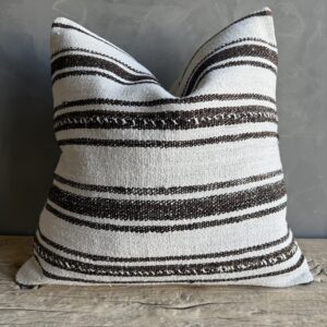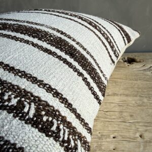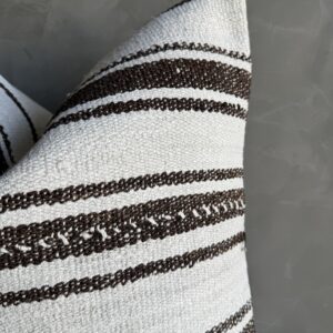Creamy white hemp rug pillow with stripes. Soft hand, linen blend backing with zipper closure. Spot cleaning is recommended, or dry clean. These rugs have been professionally cleaned prior to construction. These durable pillows will last for years, and are great for high use areas.