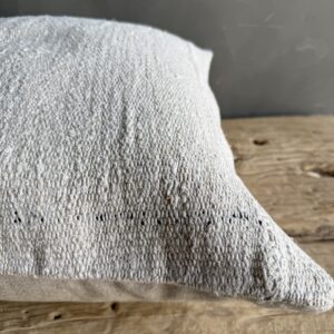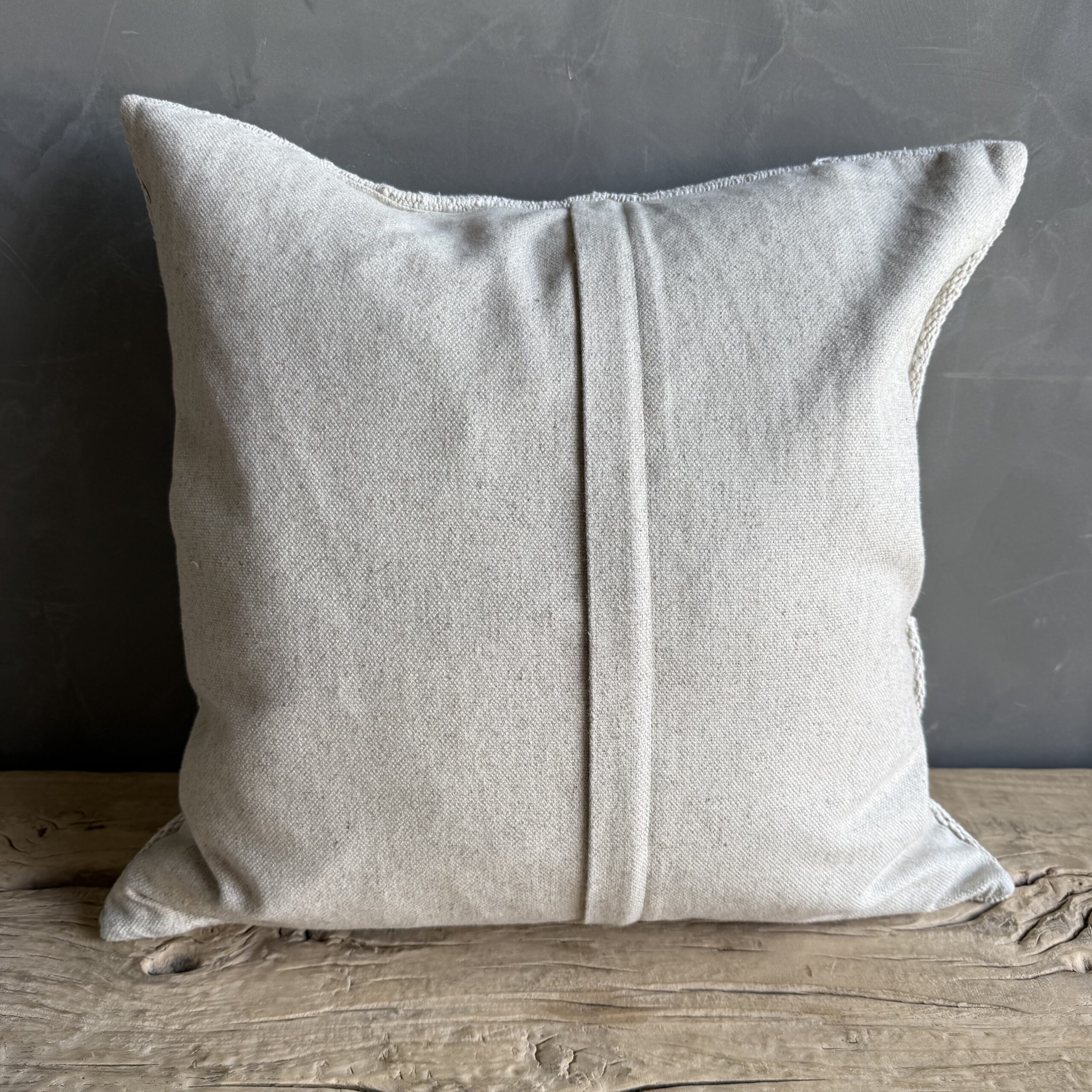 Creamy white hemp rug pillow. Soft hand, linen blend backing with zipper closure. Spot cleaning is recommended, or dry clean. These rugs have been professionally cleaned prior to construction. These durable pillows will last for years, and are great for high use areas.