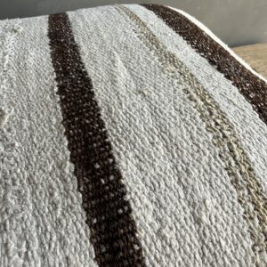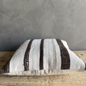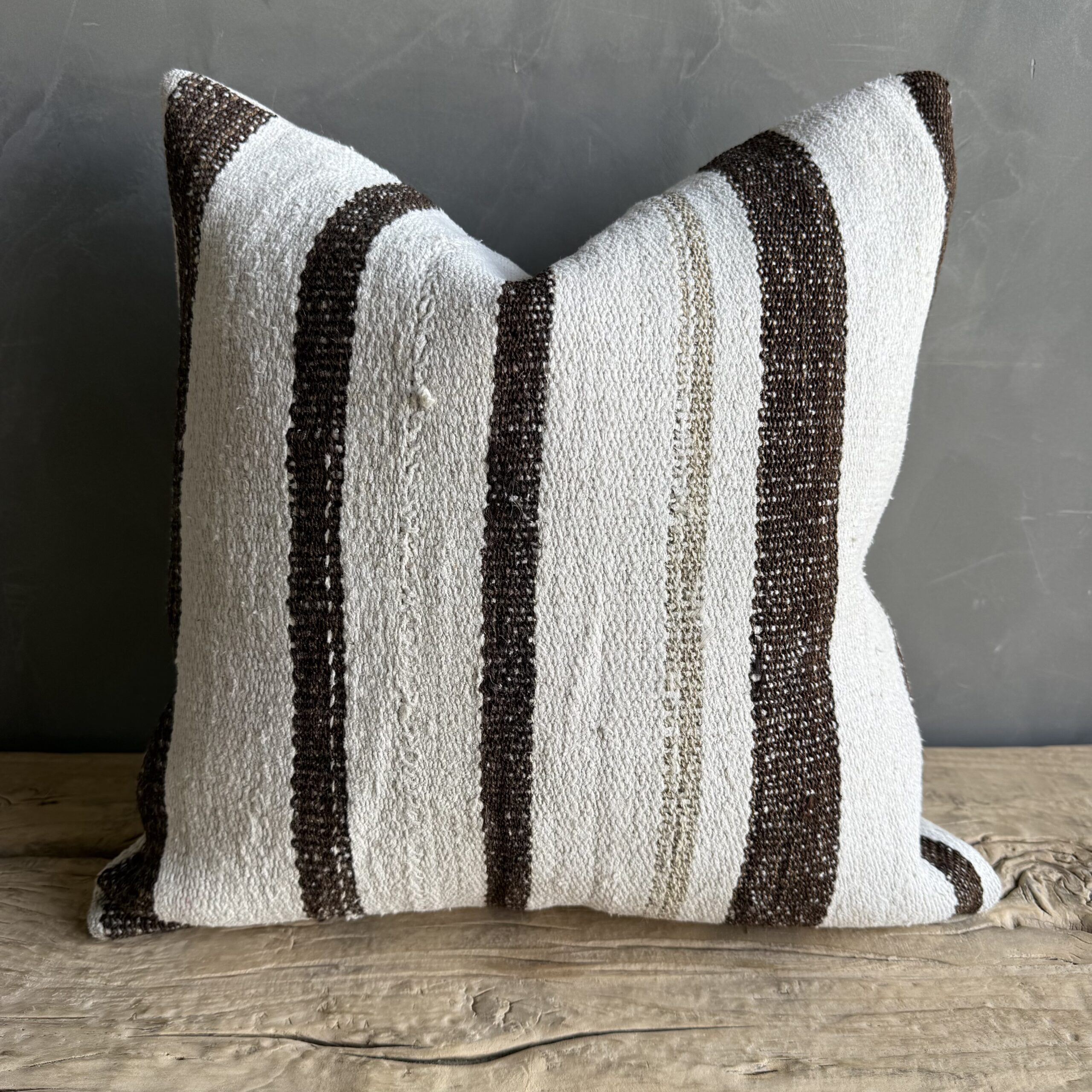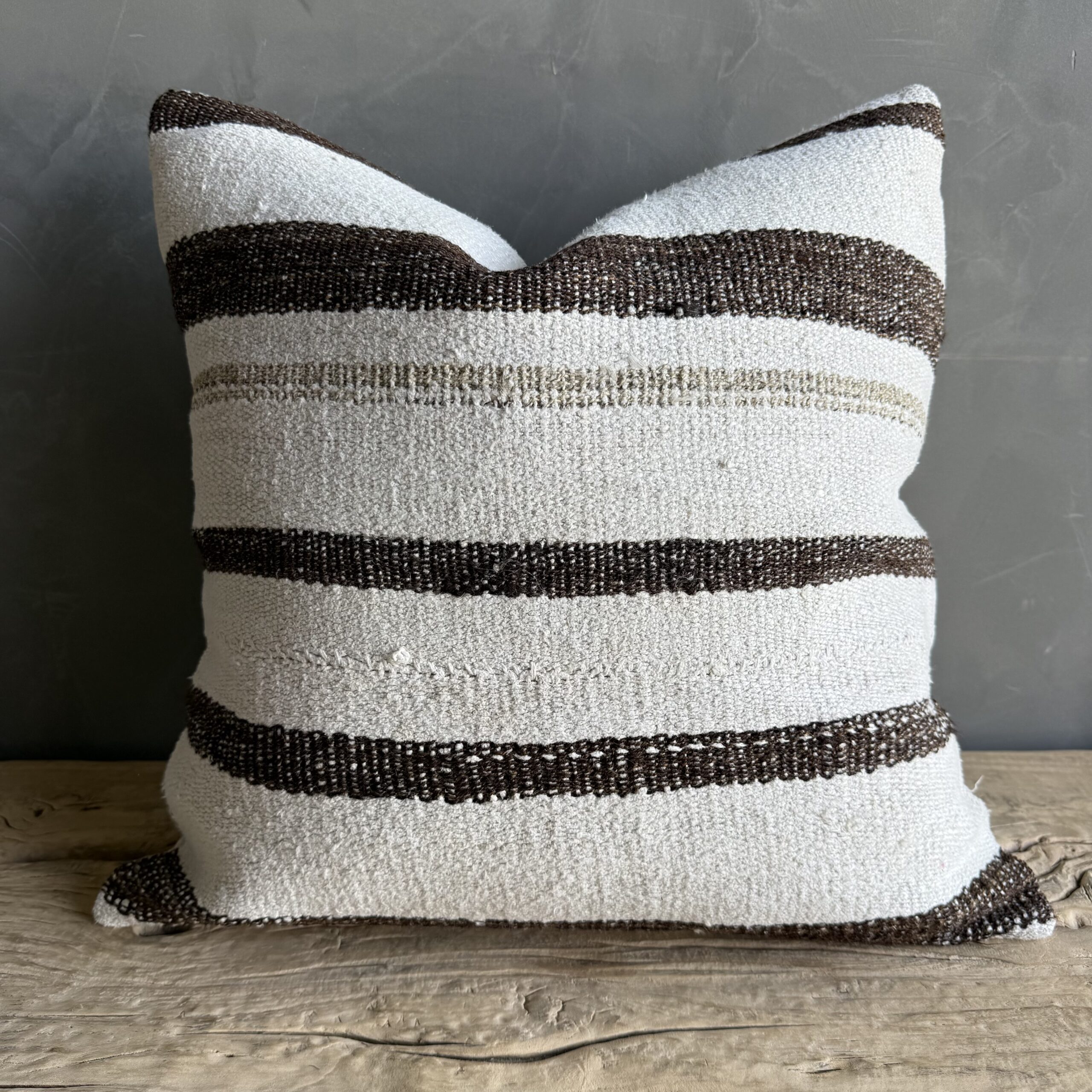 Creamy white hemp rug pillow with stripes. Soft hand, linen blend backing with zipper closure. Spot cleaning is recommended, or dry clean. These rugs have been professionally cleaned prior to construction. These durable pillows will last for years, and are great for high use areas.