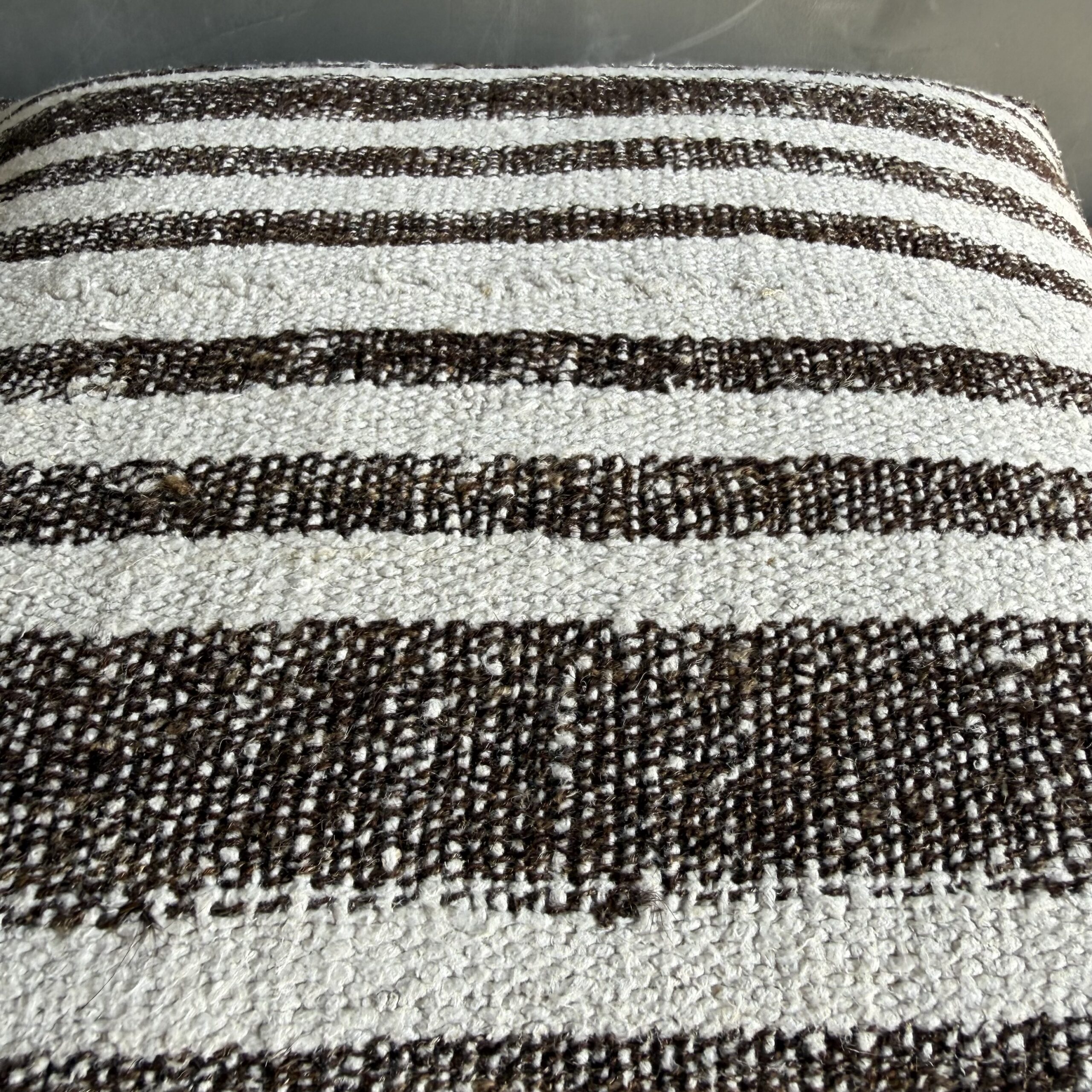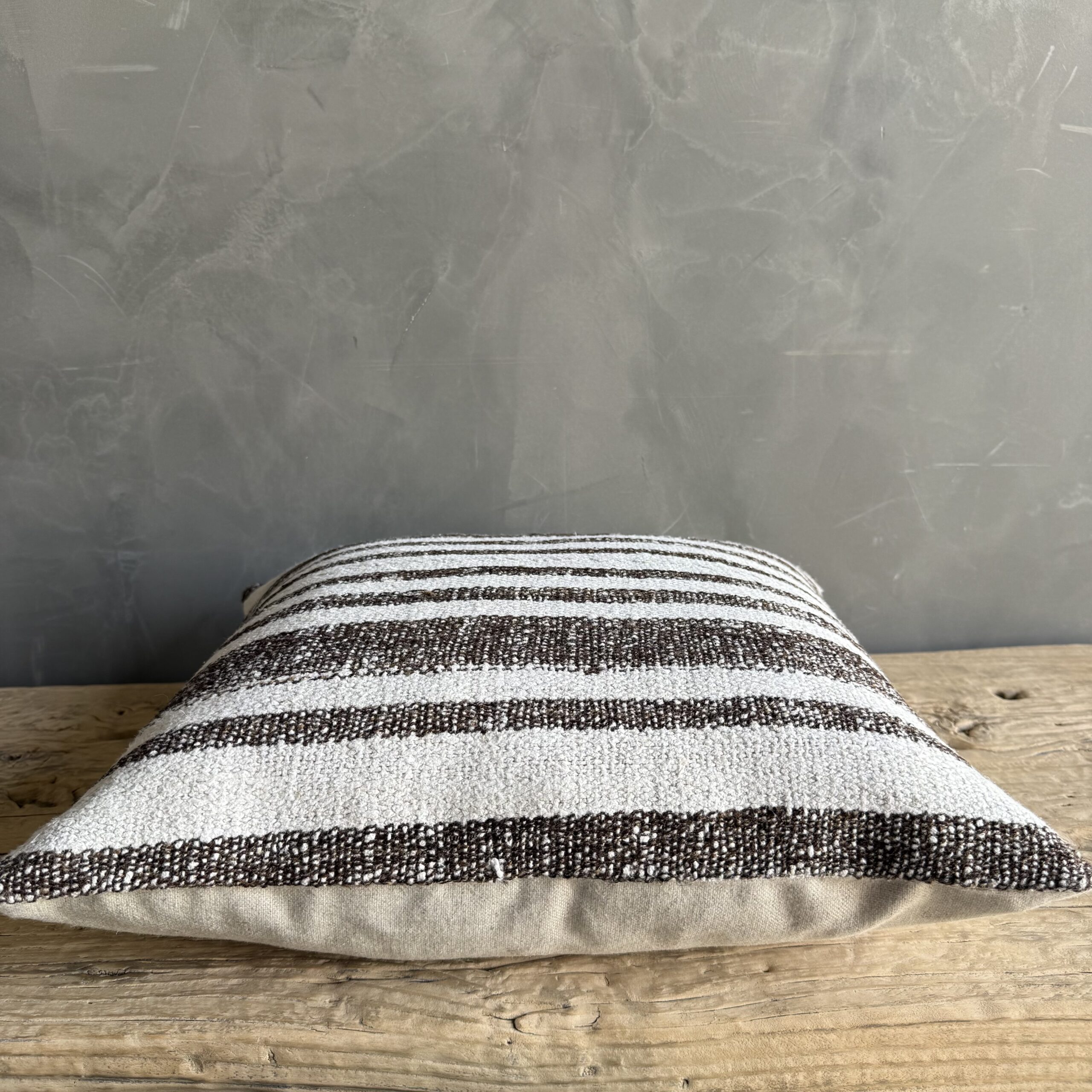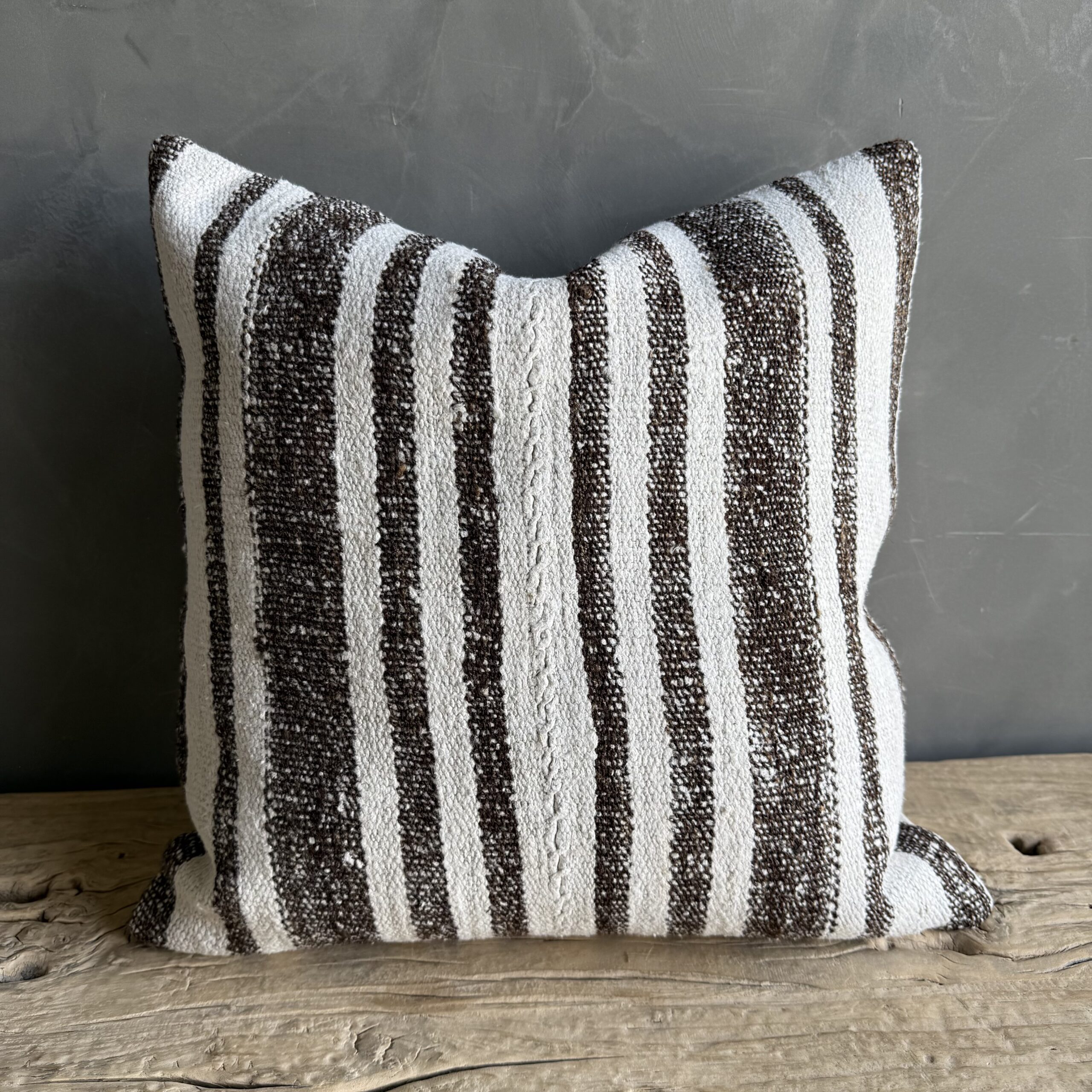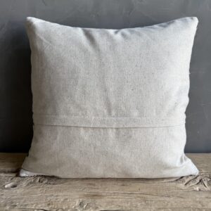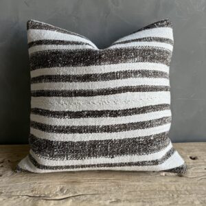 Creamy white hemp rug pillow with stripes. Soft hand, linen blend backing with zipper closure. Spot cleaning is recommended, or dry clean. These rugs have been professionally cleaned prior to construction. These durable pillows will last for years, and are great for high use areas.