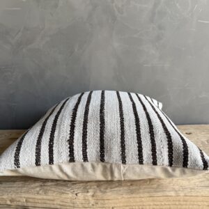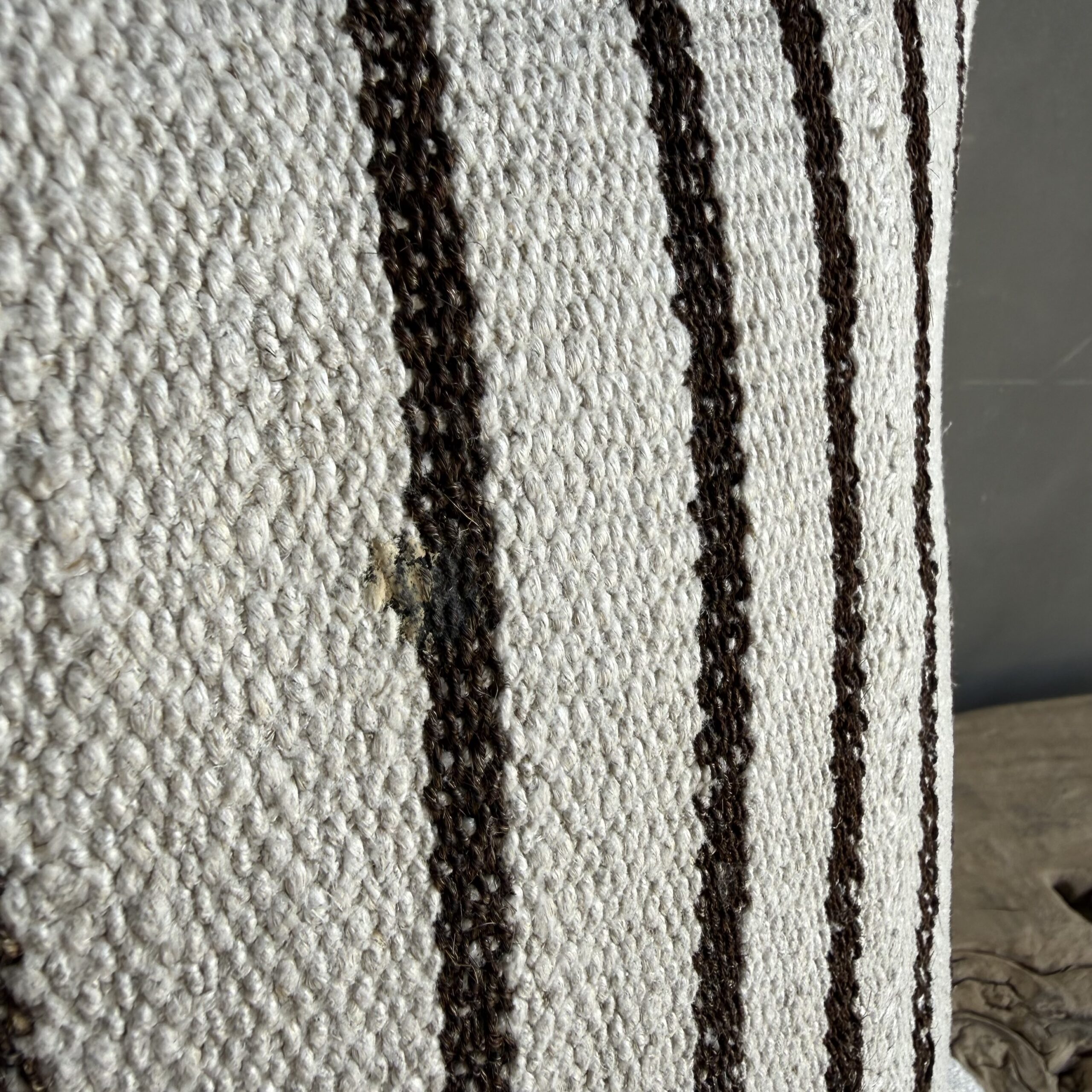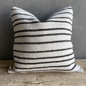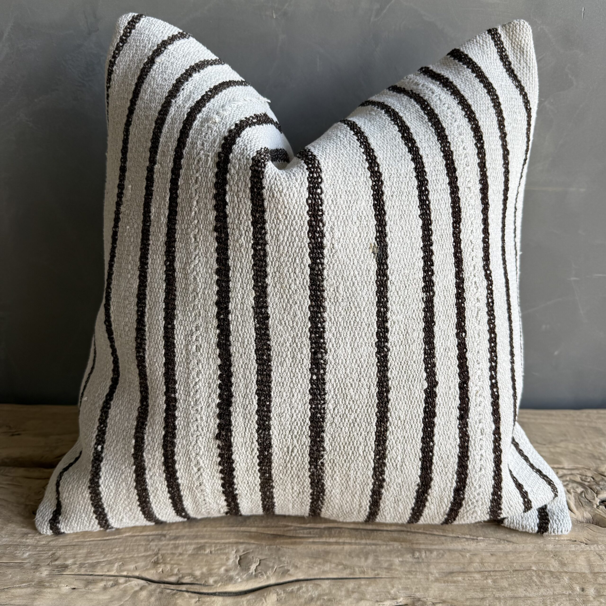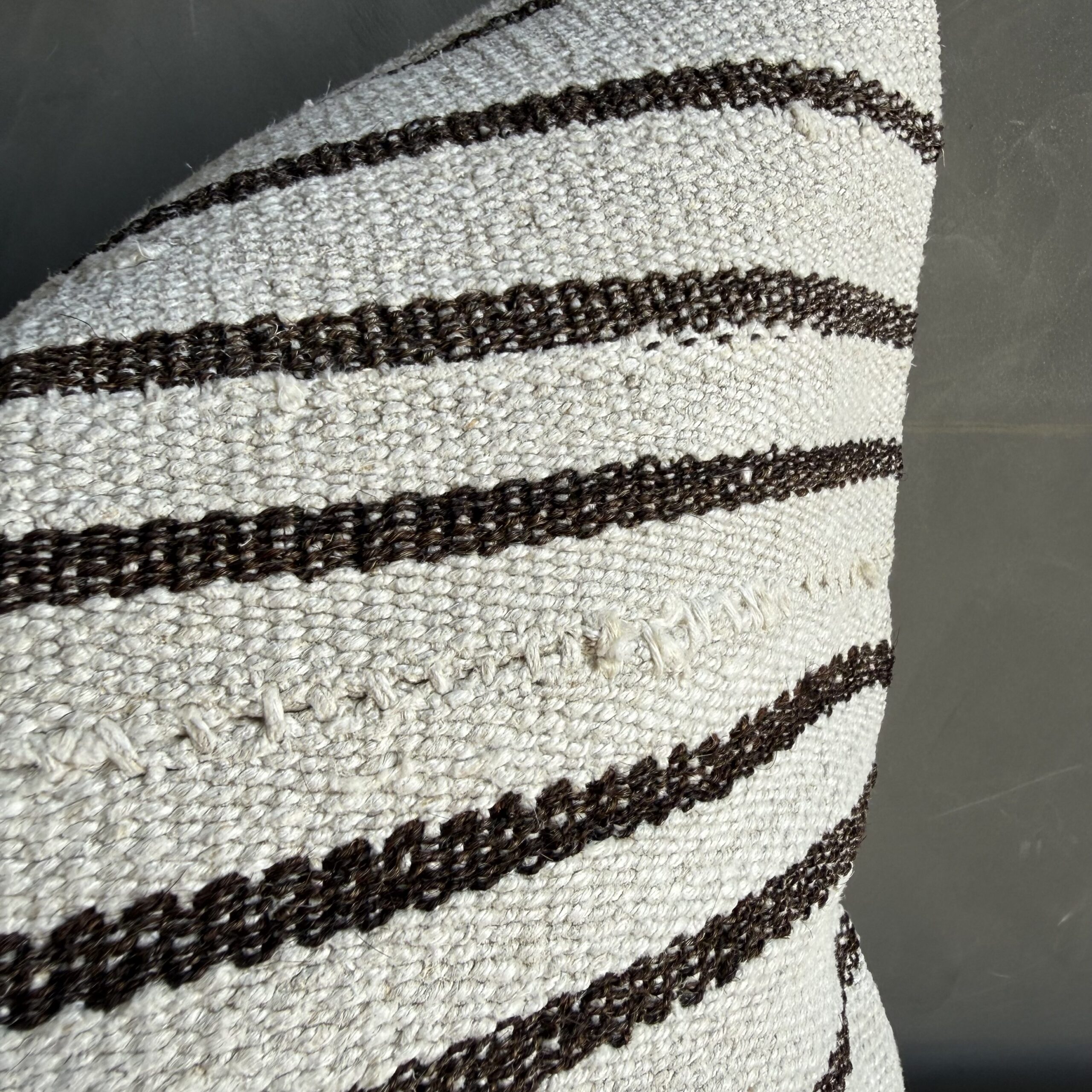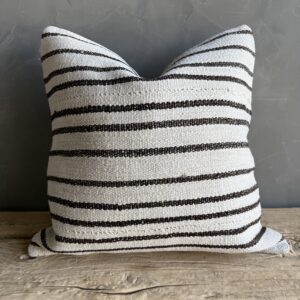 Creamy white hemp rug pillow with stripes. Soft hand, linen blend backing with zipper closure. Spot cleaning is recommended, or dry clean. These rugs have been professionally cleaned prior to construction. These durable pillows will last for years, and are great for high use areas.