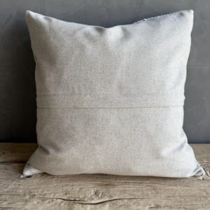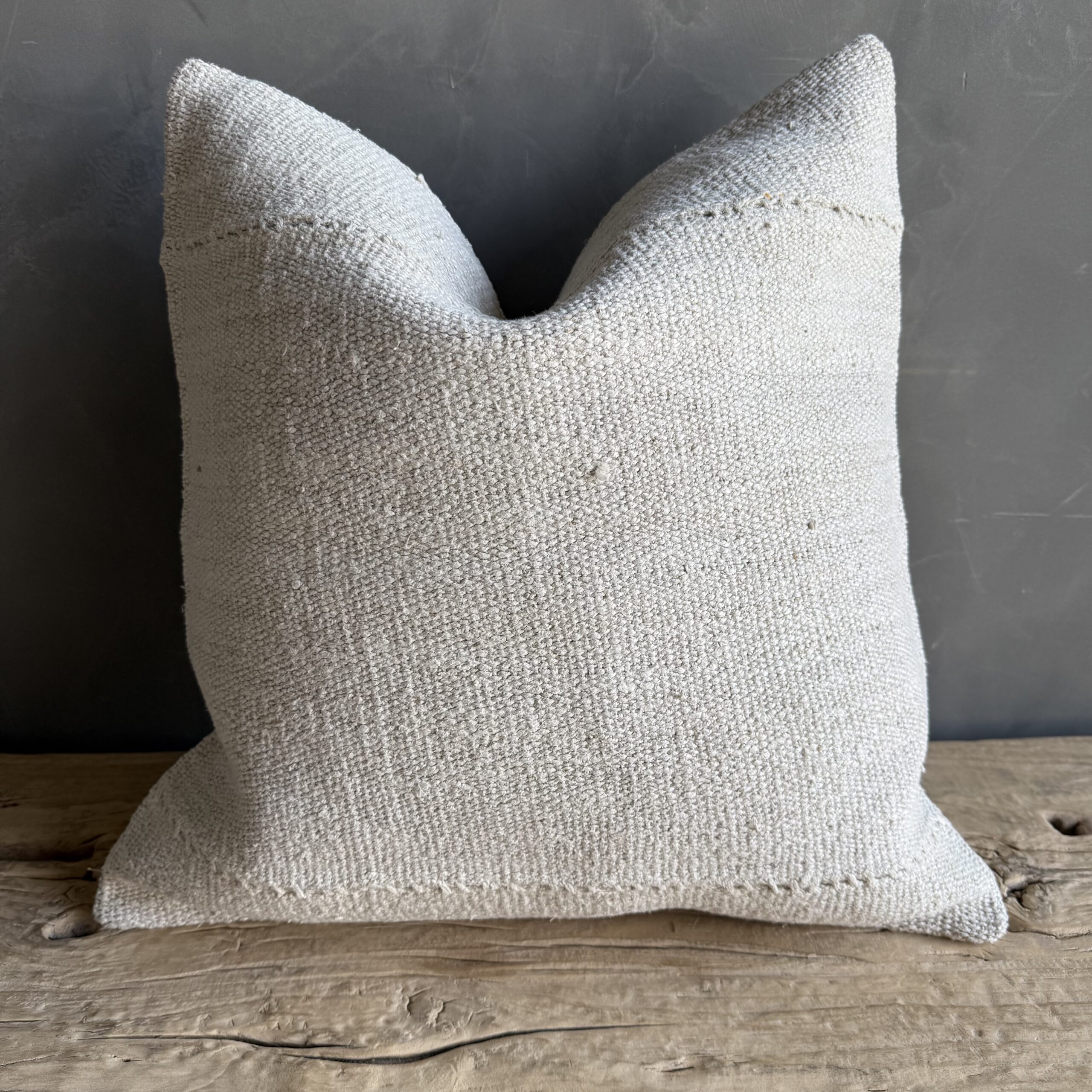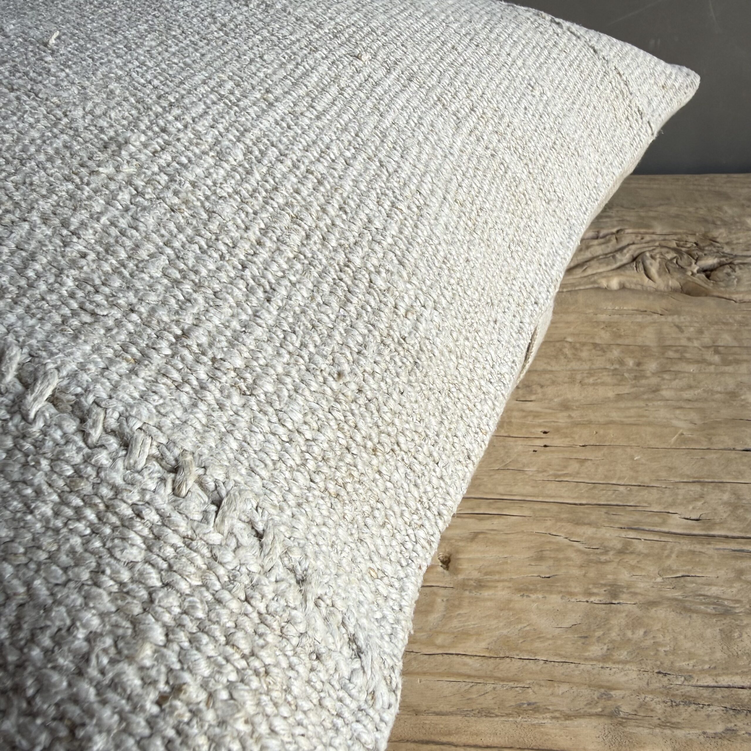 Creamy white hemp rug pillow. Soft hand, linen blend backing with zipper closure. Spot cleaning is recommended, or dry clean. These rugs have been professionally cleaned prior to construction. These durable pillows will last for years, and are great for high use areas.