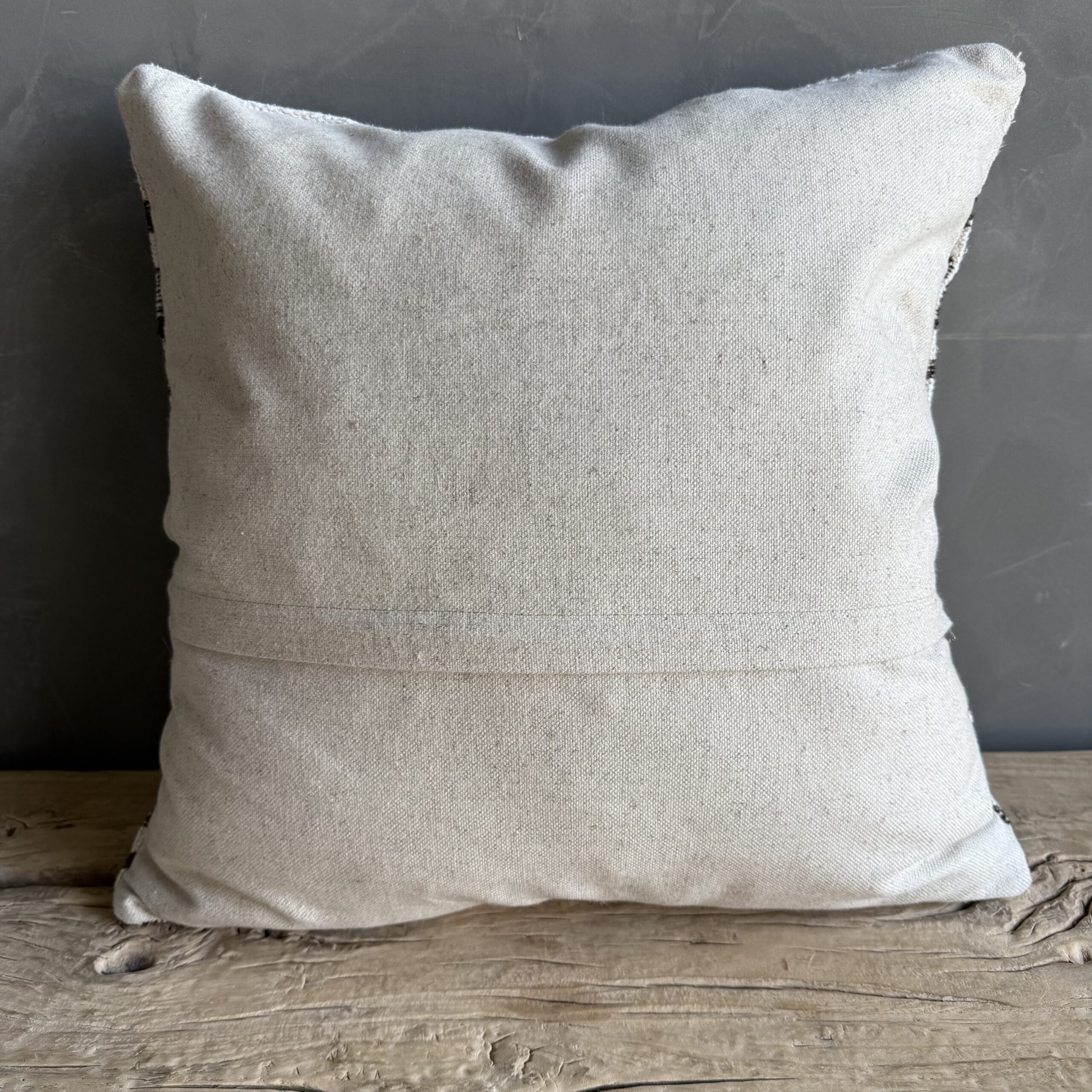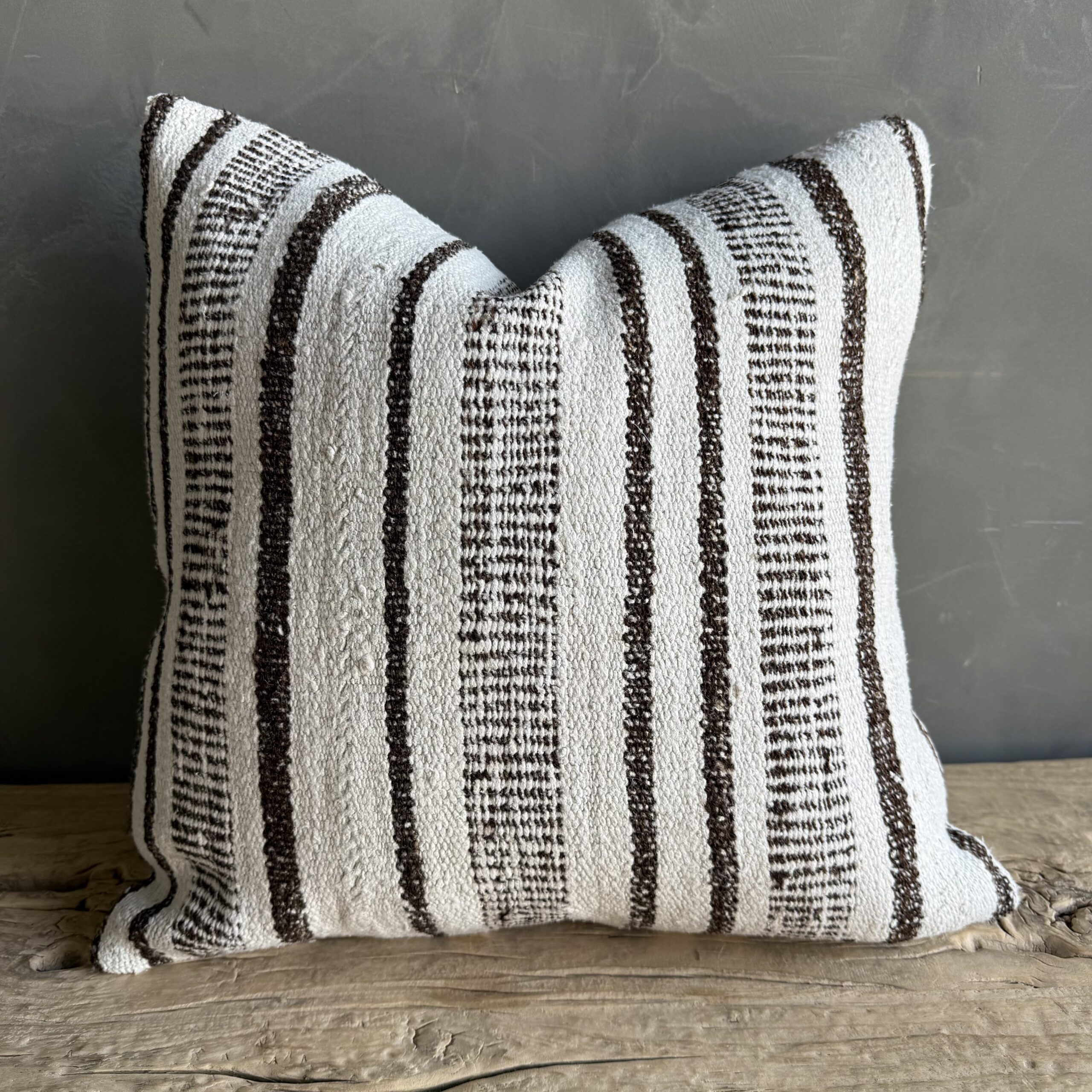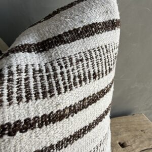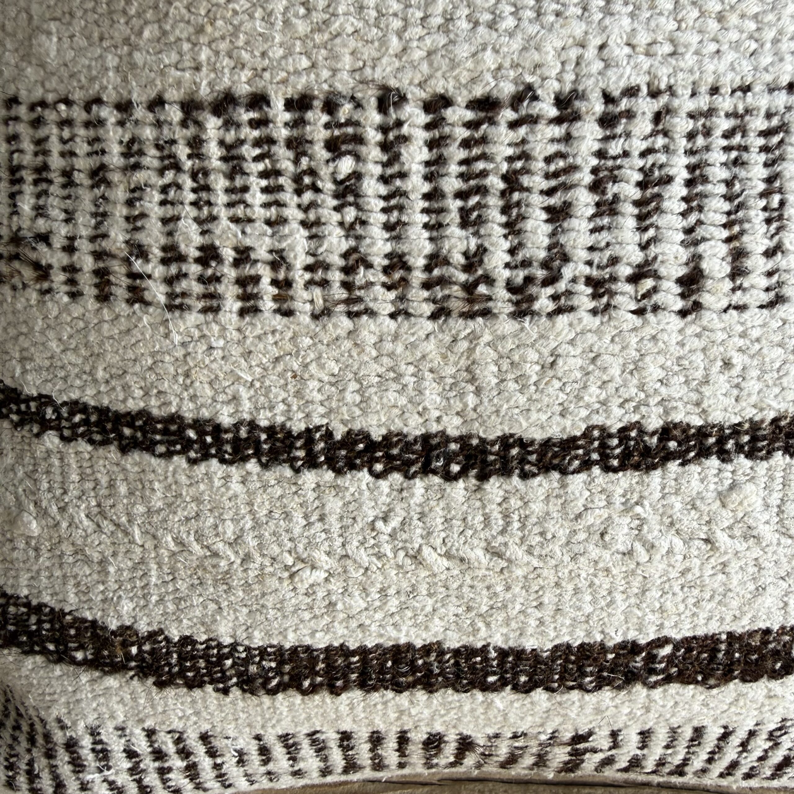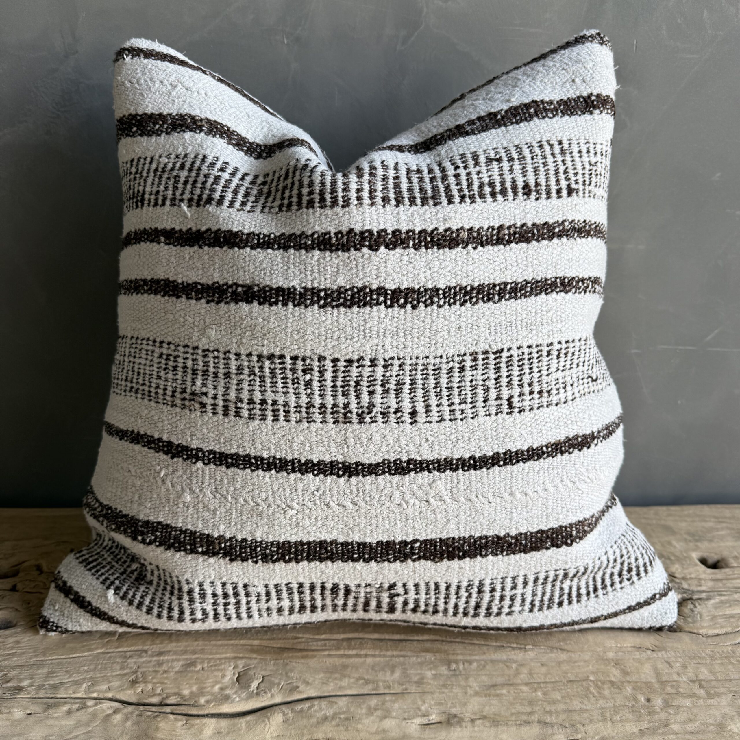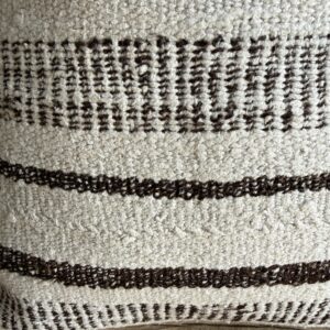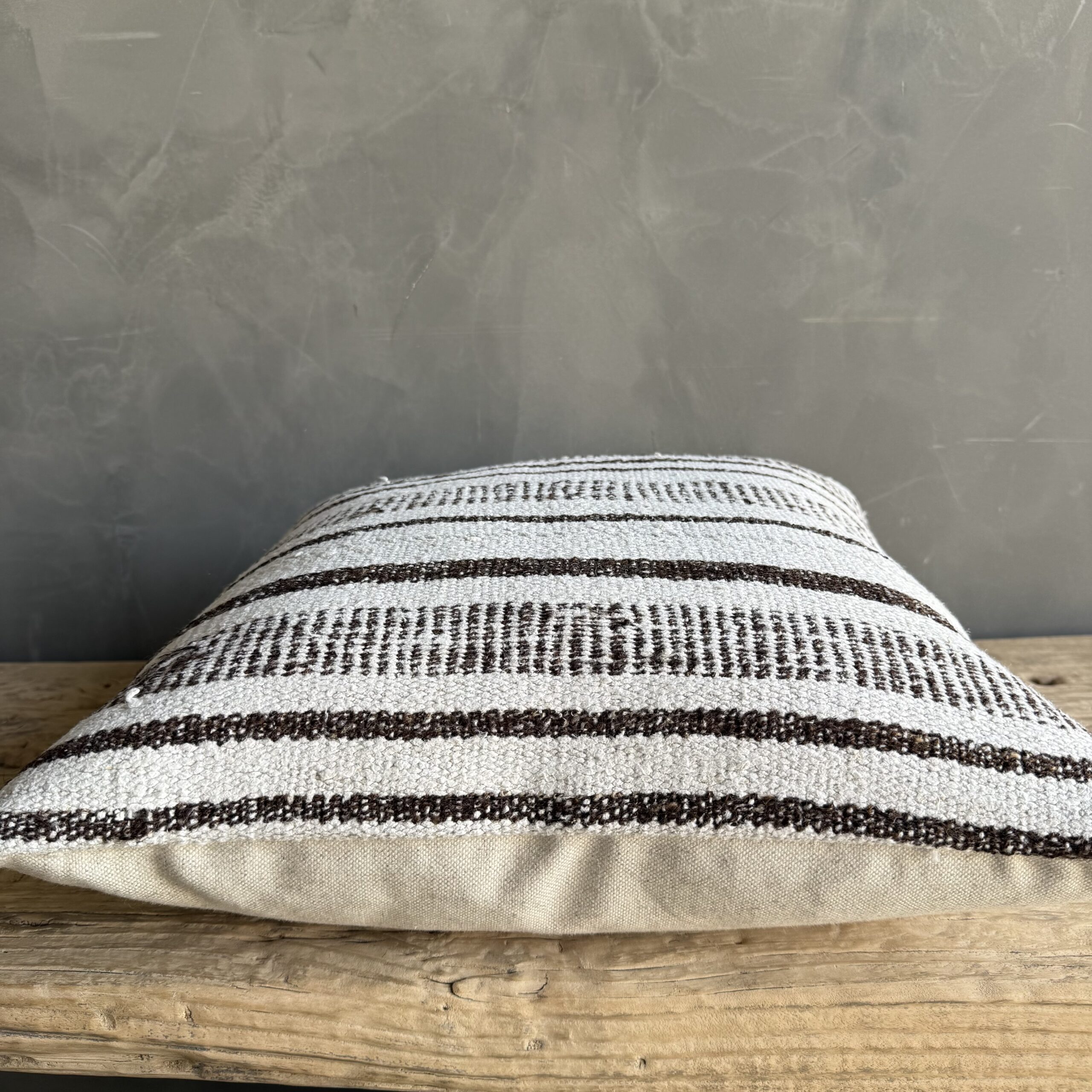 Creamy white hemp rug pillow with stripes. Soft hand, linen blend backing with zipper closure. Spot cleaning is recommended, or dry clean. These rugs have been professionally cleaned prior to construction. These durable pillows will last for years, and are great for high use areas.