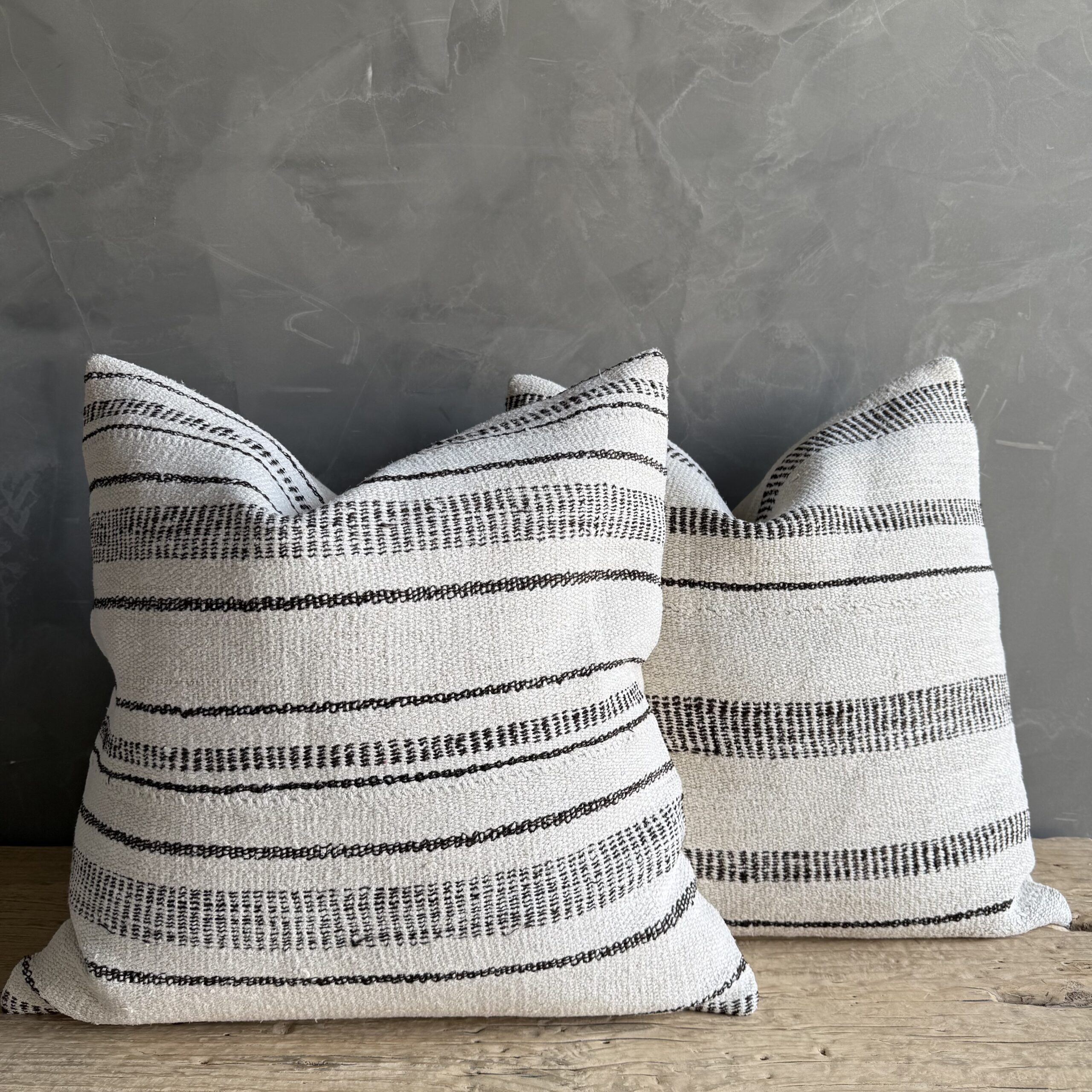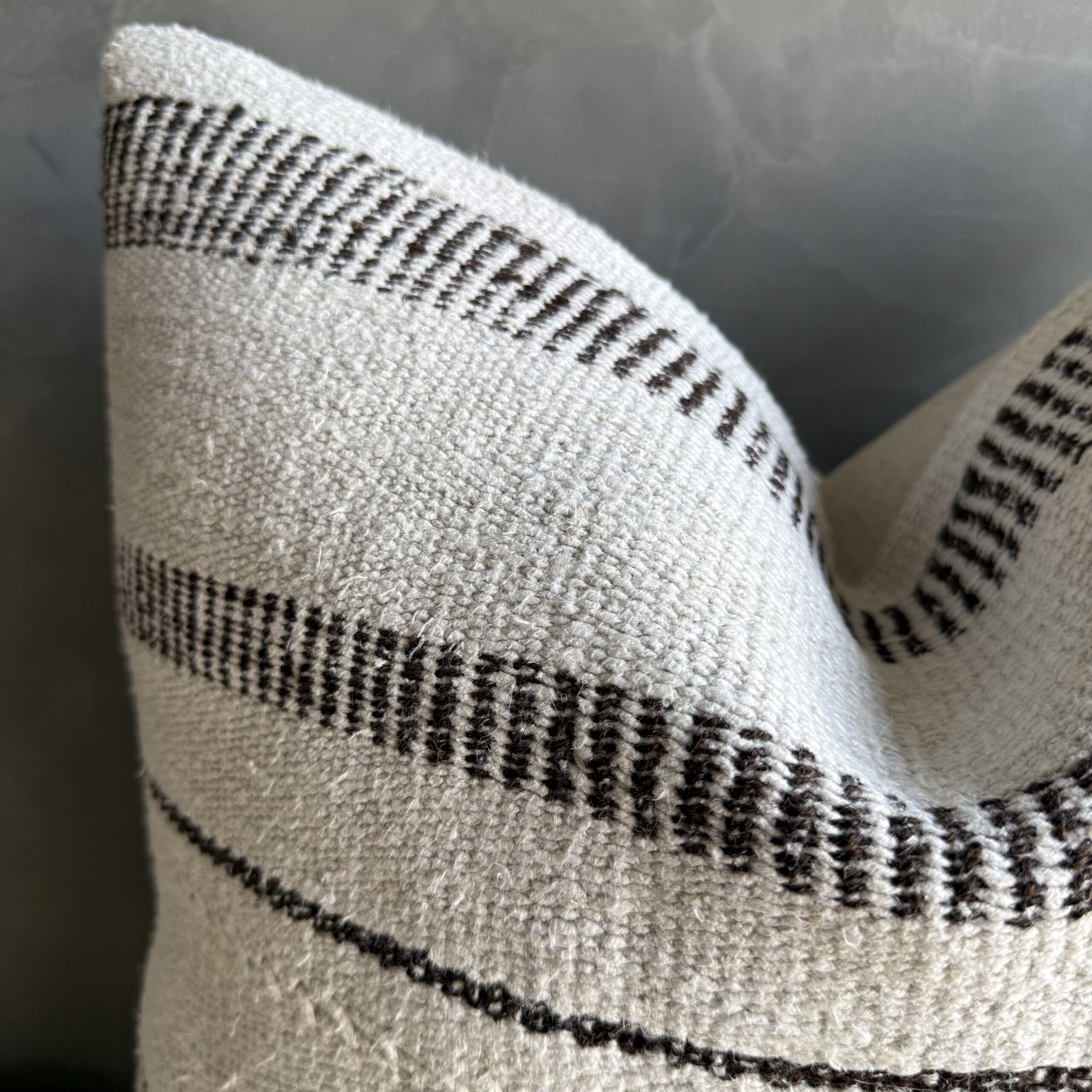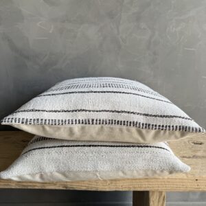 Creamy white hemp rug pillow with stripes. Soft hand, linen blend backing with zipper closure. Spot cleaning is recommended, or dry clean. These rugs have been professionally cleaned prior to construction. These durable pillows will last for years, and are great for high use areas.