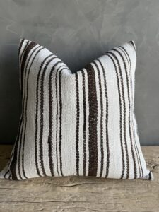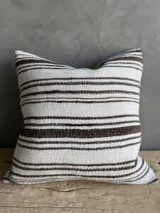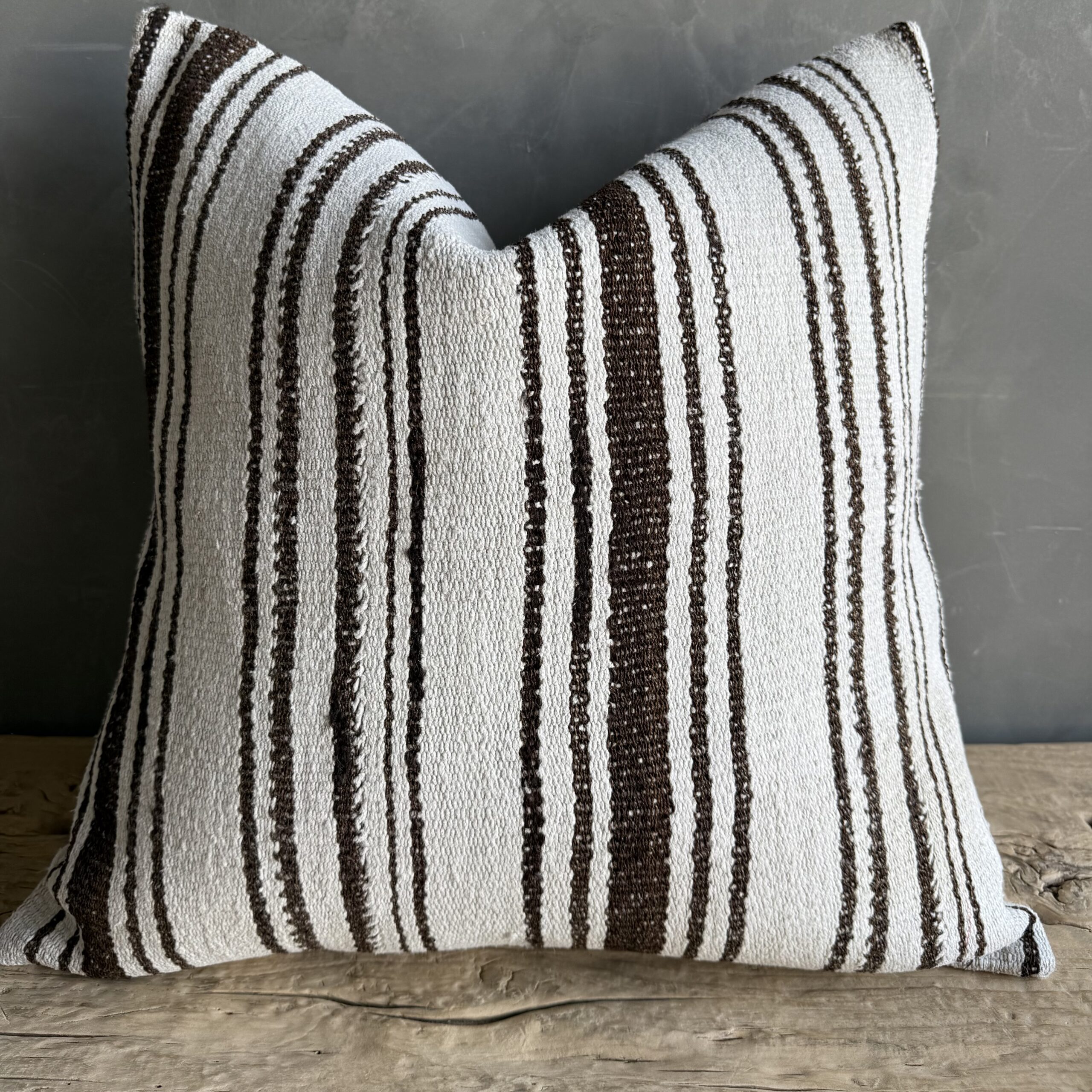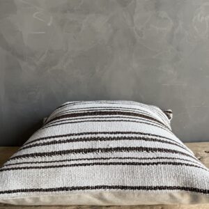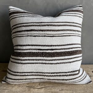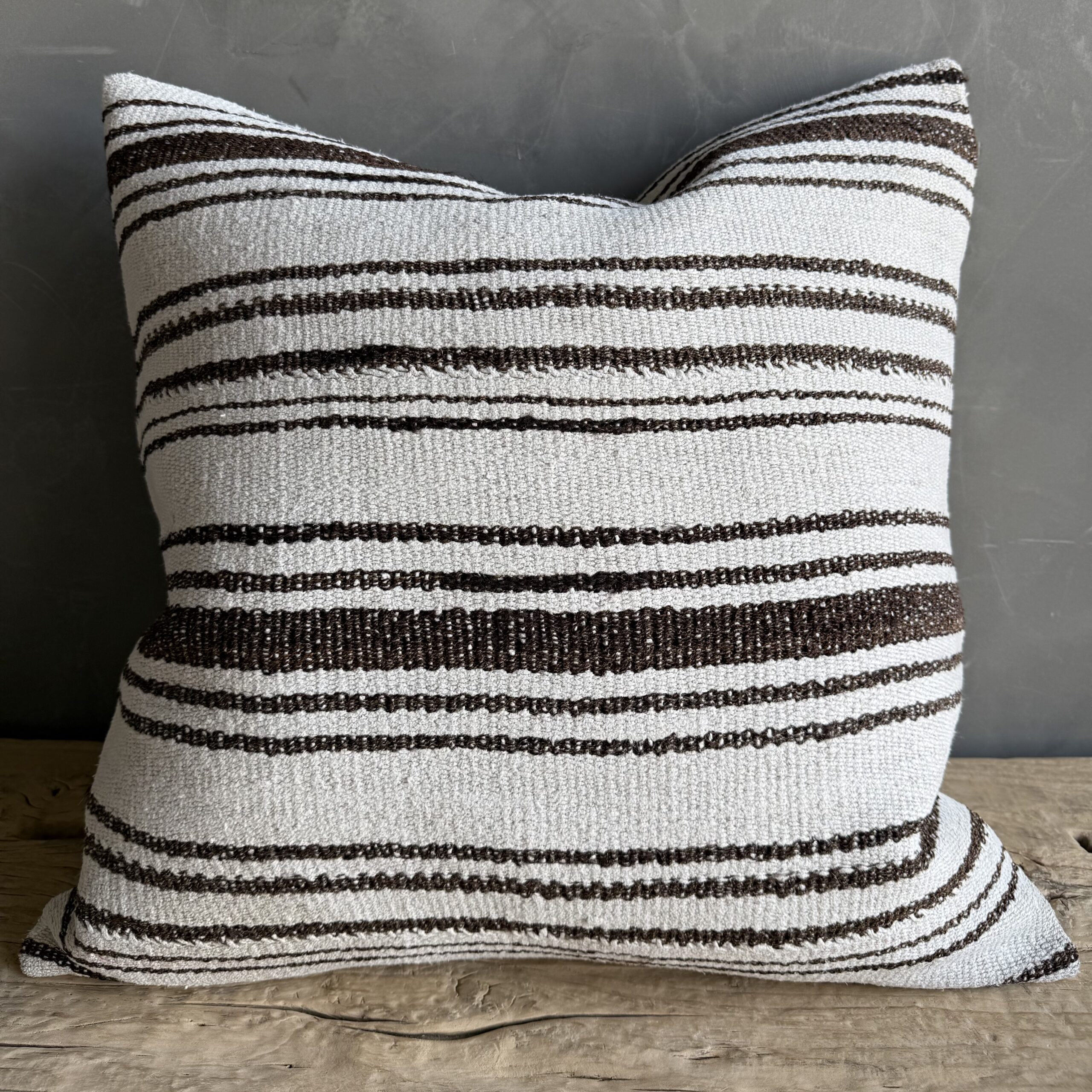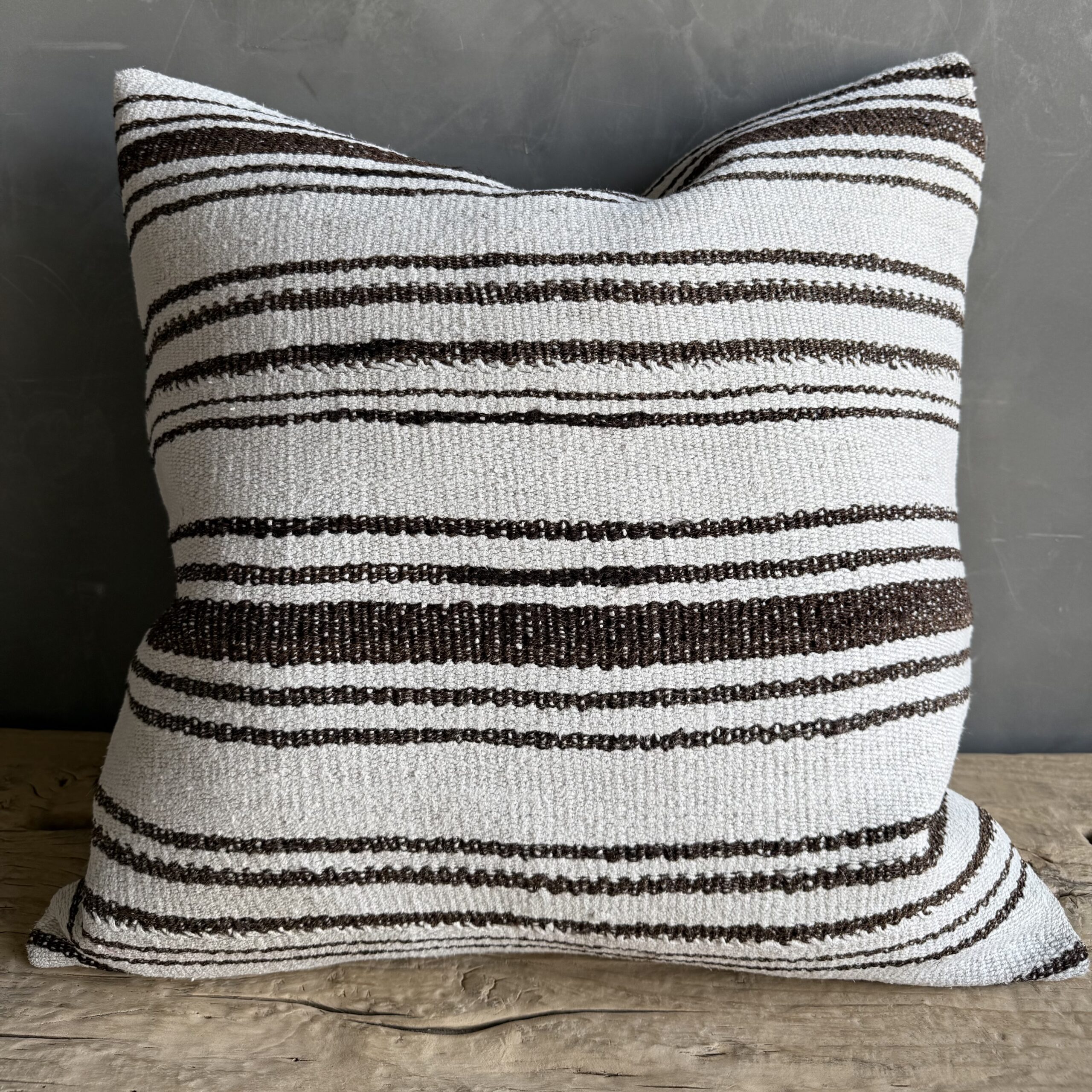Creamy white hemp rug pillow with stripes. Soft hand, linen blend backing with zipper closure. Spot cleaning is recommended, or dry clean. These rugs have been professionally cleaned prior to construction. These durable pillows will last for years, and are great for high use areas.