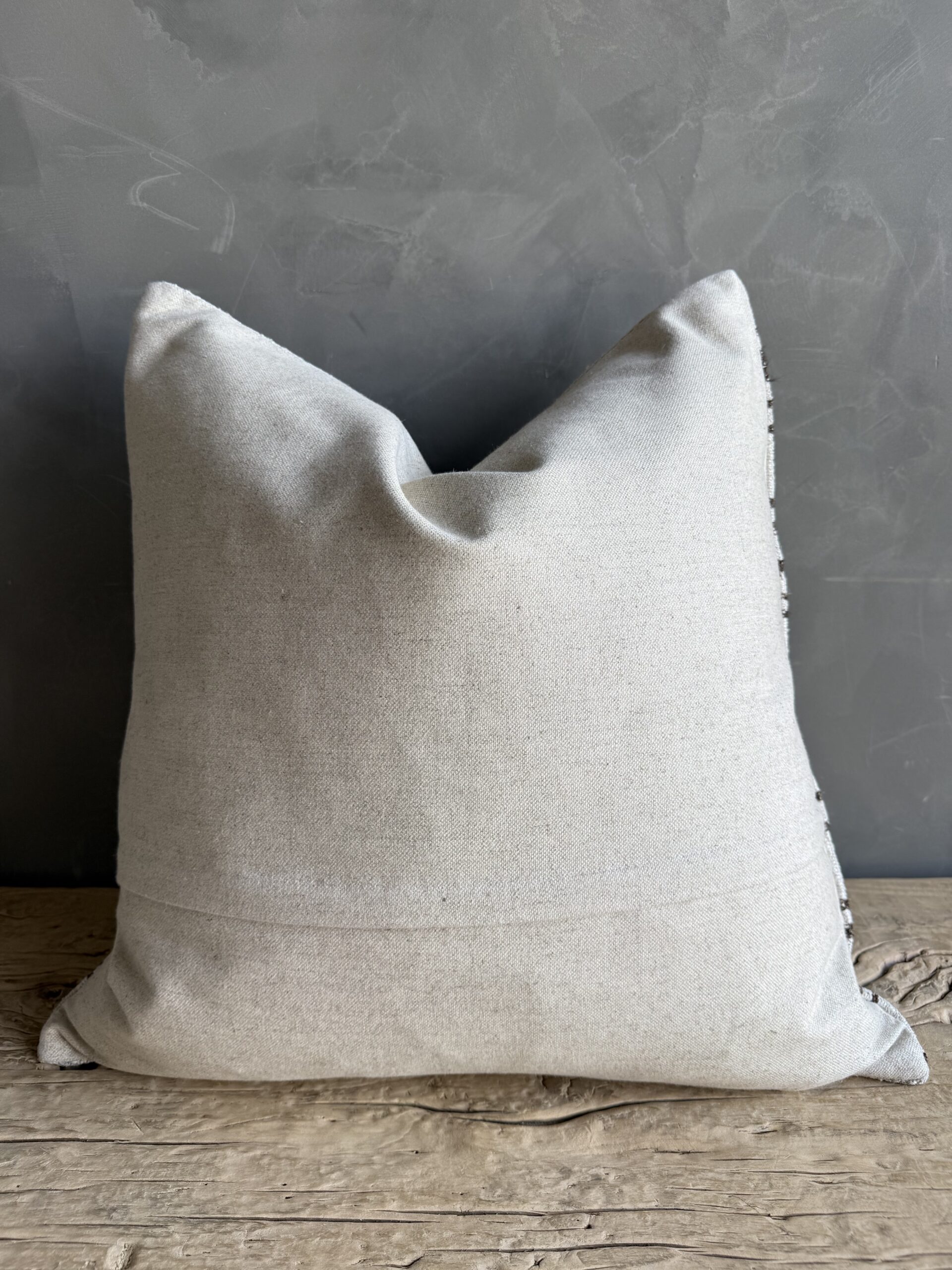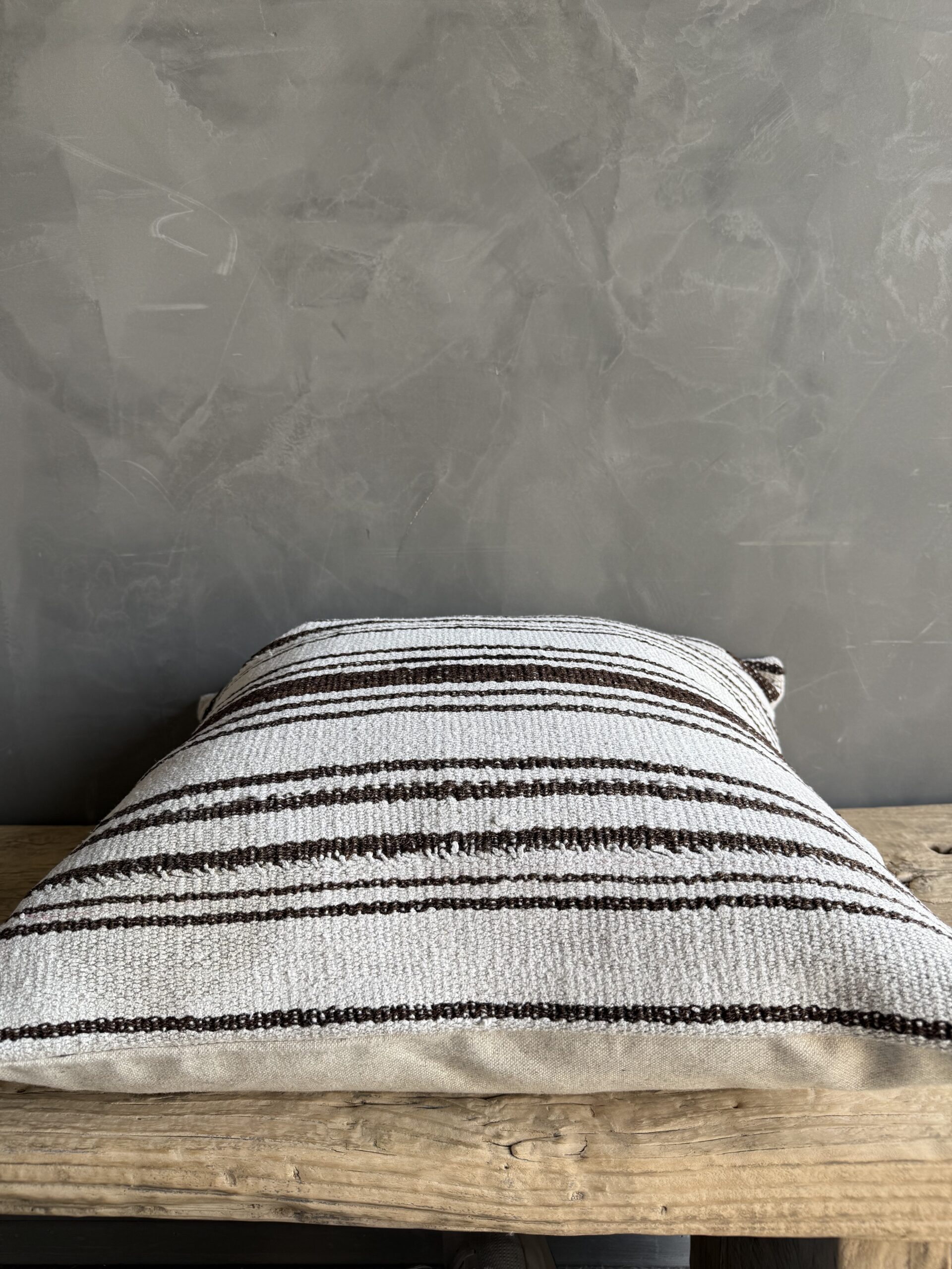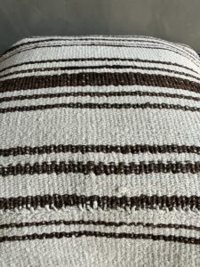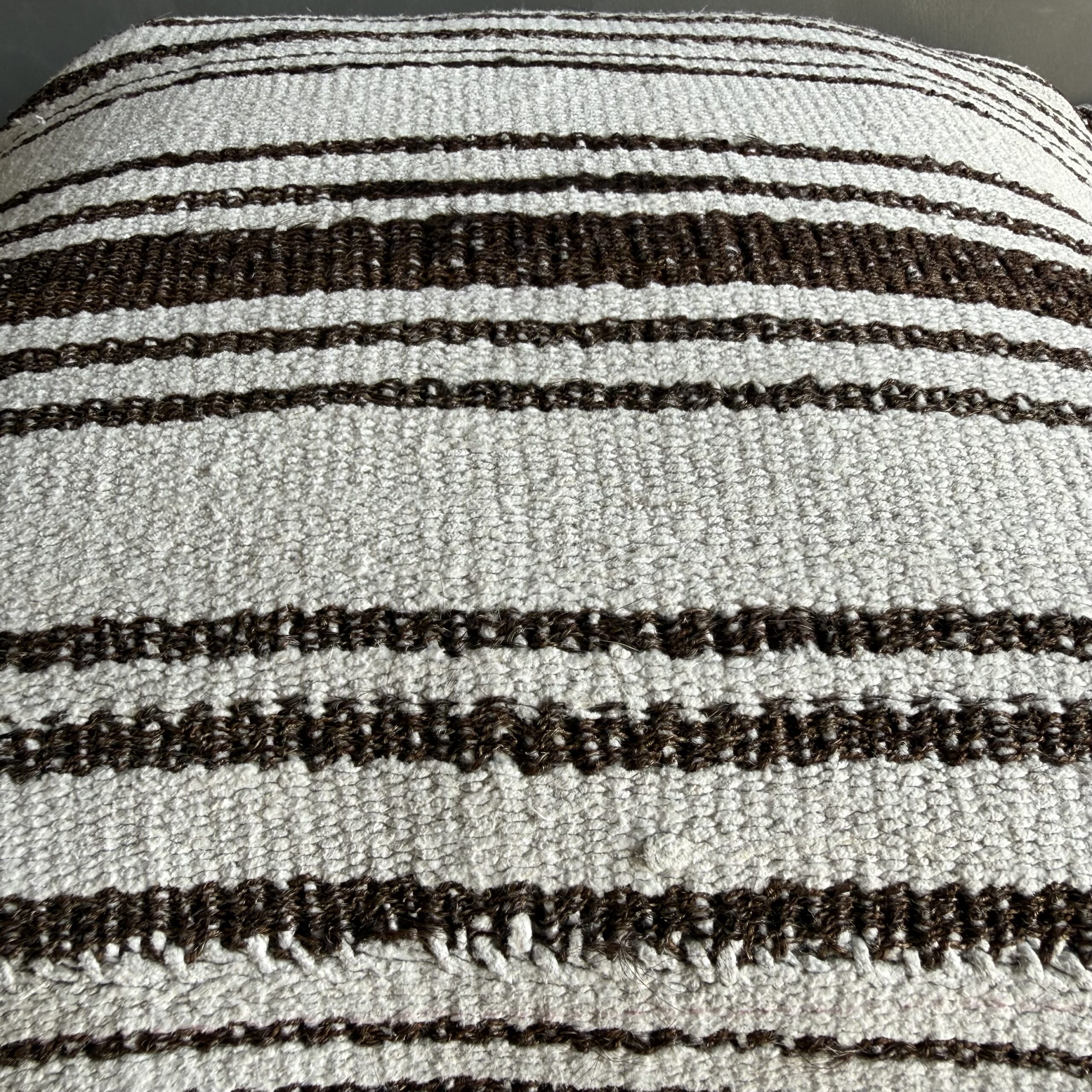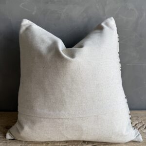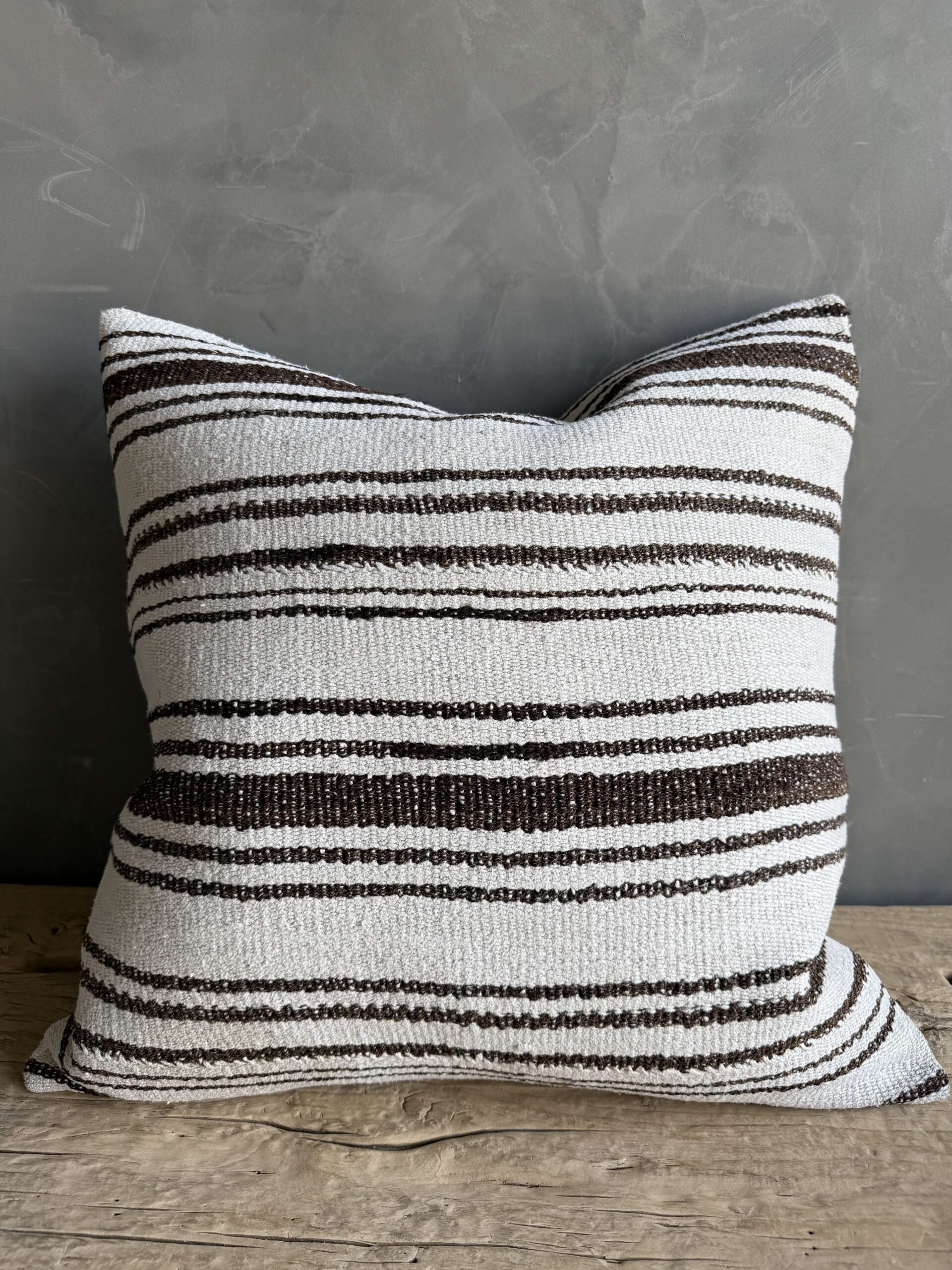 Creamy white hemp rug pillow with stripes. Soft hand, linen blend backing with zipper closure. Spot cleaning is recommended, or dry clean. These rugs have been professionally cleaned prior to construction. These durable pillows will last for years, and are great for high use areas.