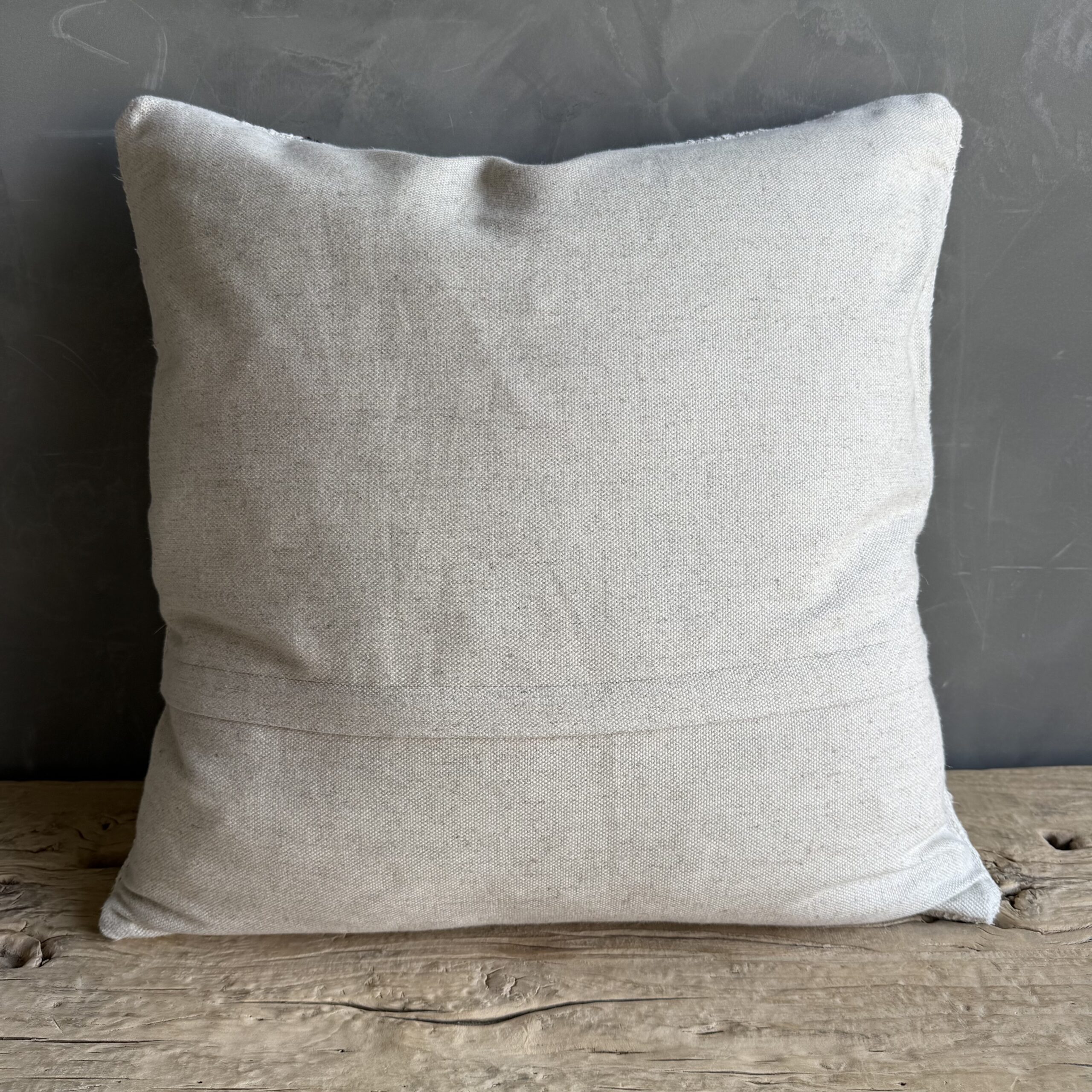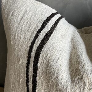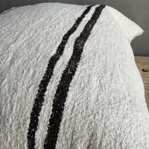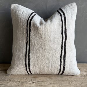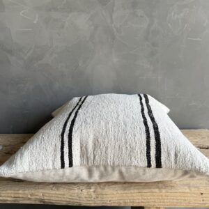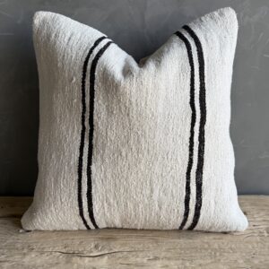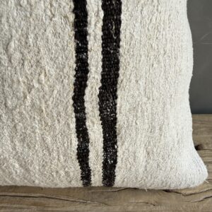 Creamy white hemp rug pillow with stripes. Soft hand, linen blend backing with zipper closure. Spot cleaning is recommended, or dry clean. These rugs have been professionally cleaned prior to construction. These durable pillows will last for years, and are great for high use areas.