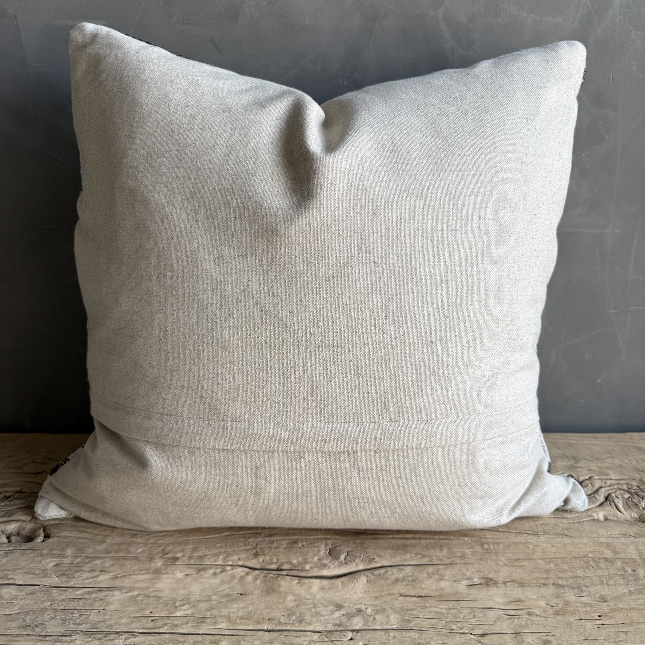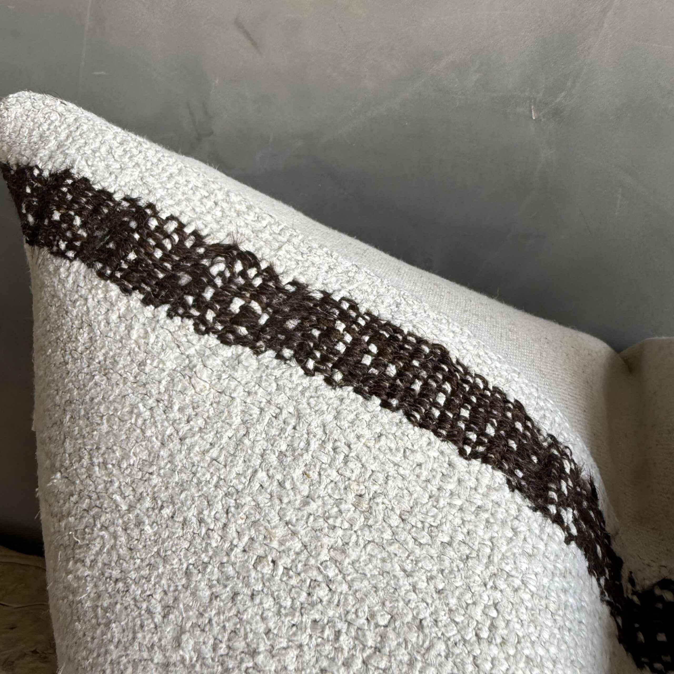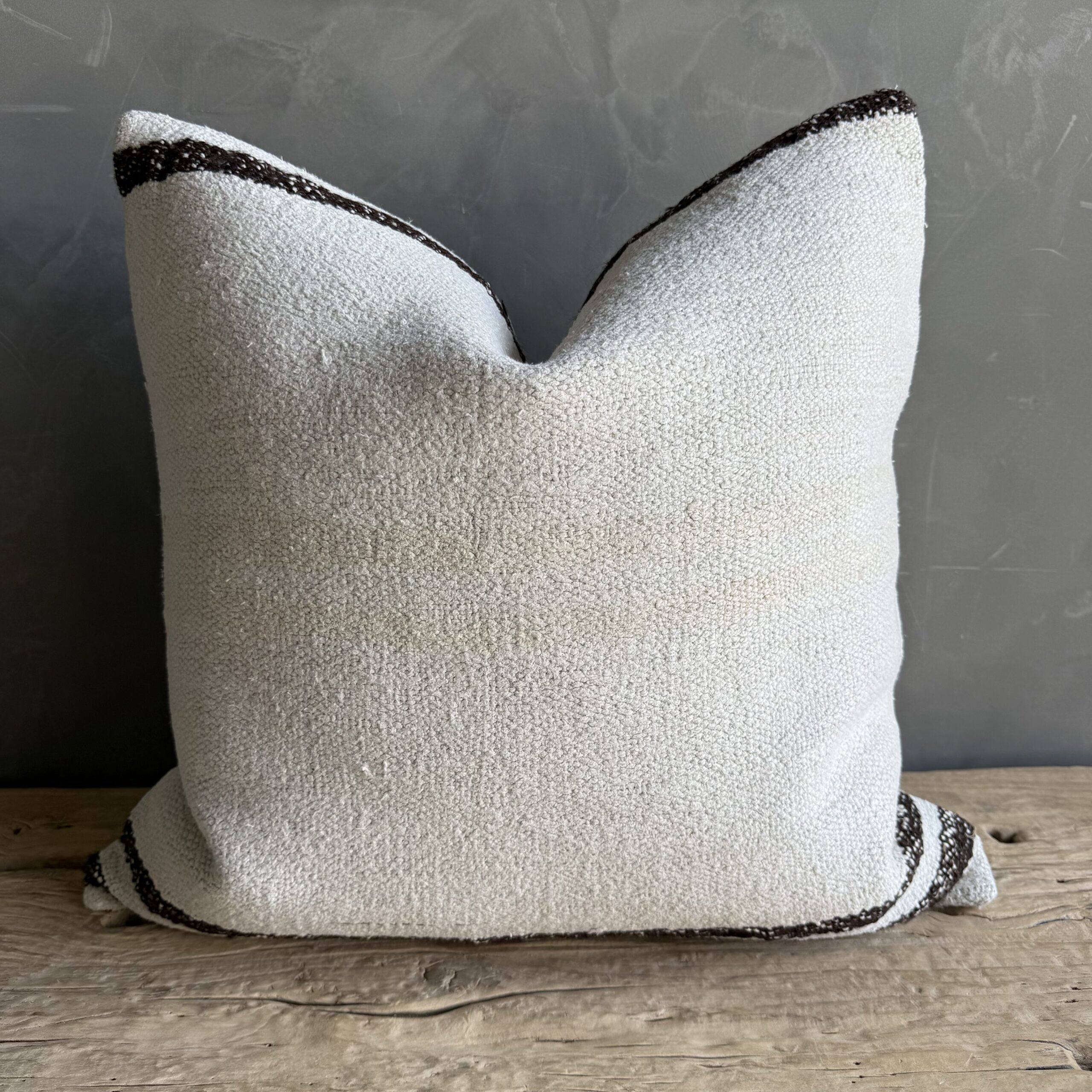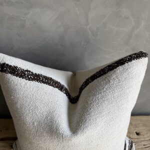 Creamy white hemp rug pillow with stripes. Soft hand, linen blend backing with zipper closure. Spot cleaning is recommended, or dry clean. These rugs have been professionally cleaned prior to construction. These durable pillows will last for years, and are great for high use areas.