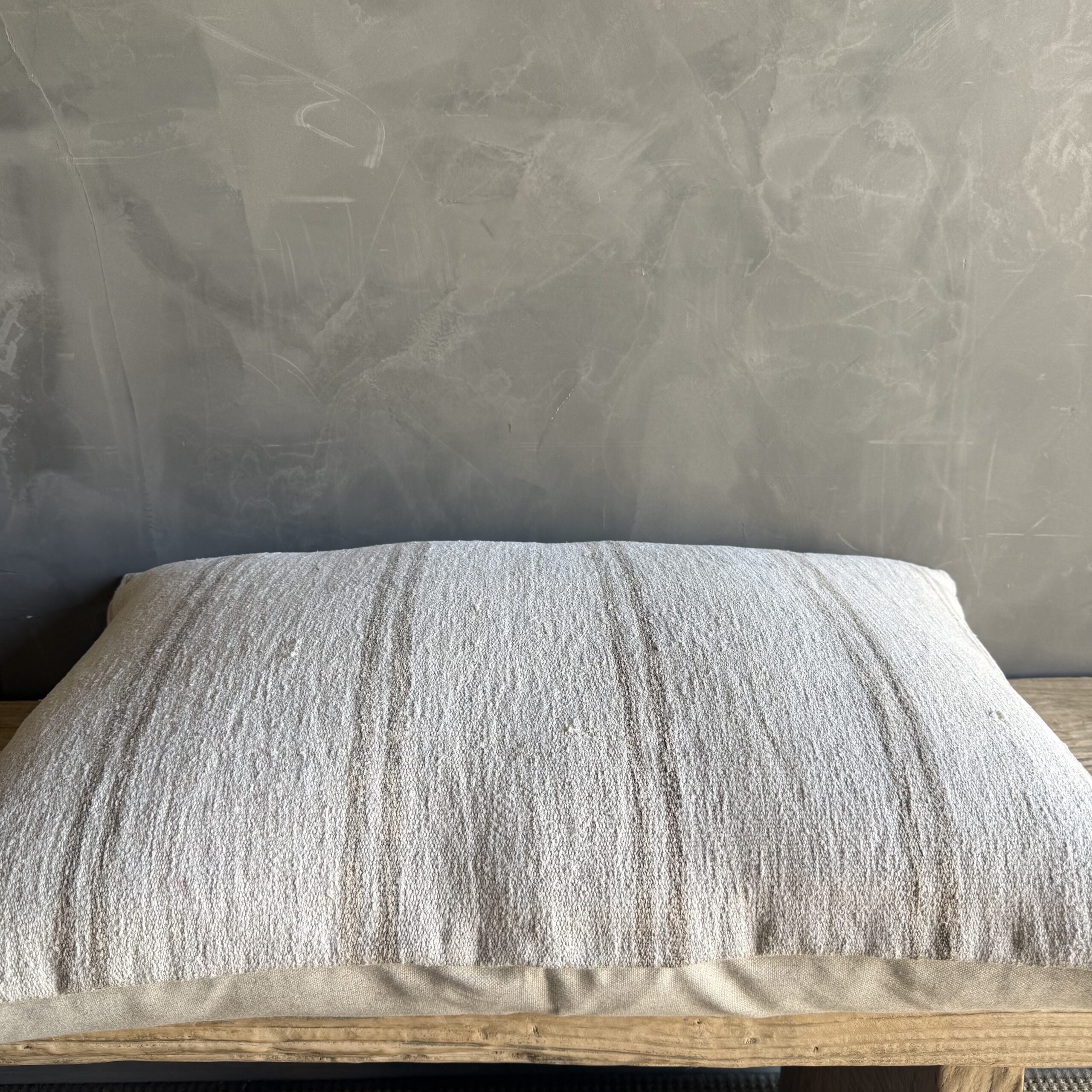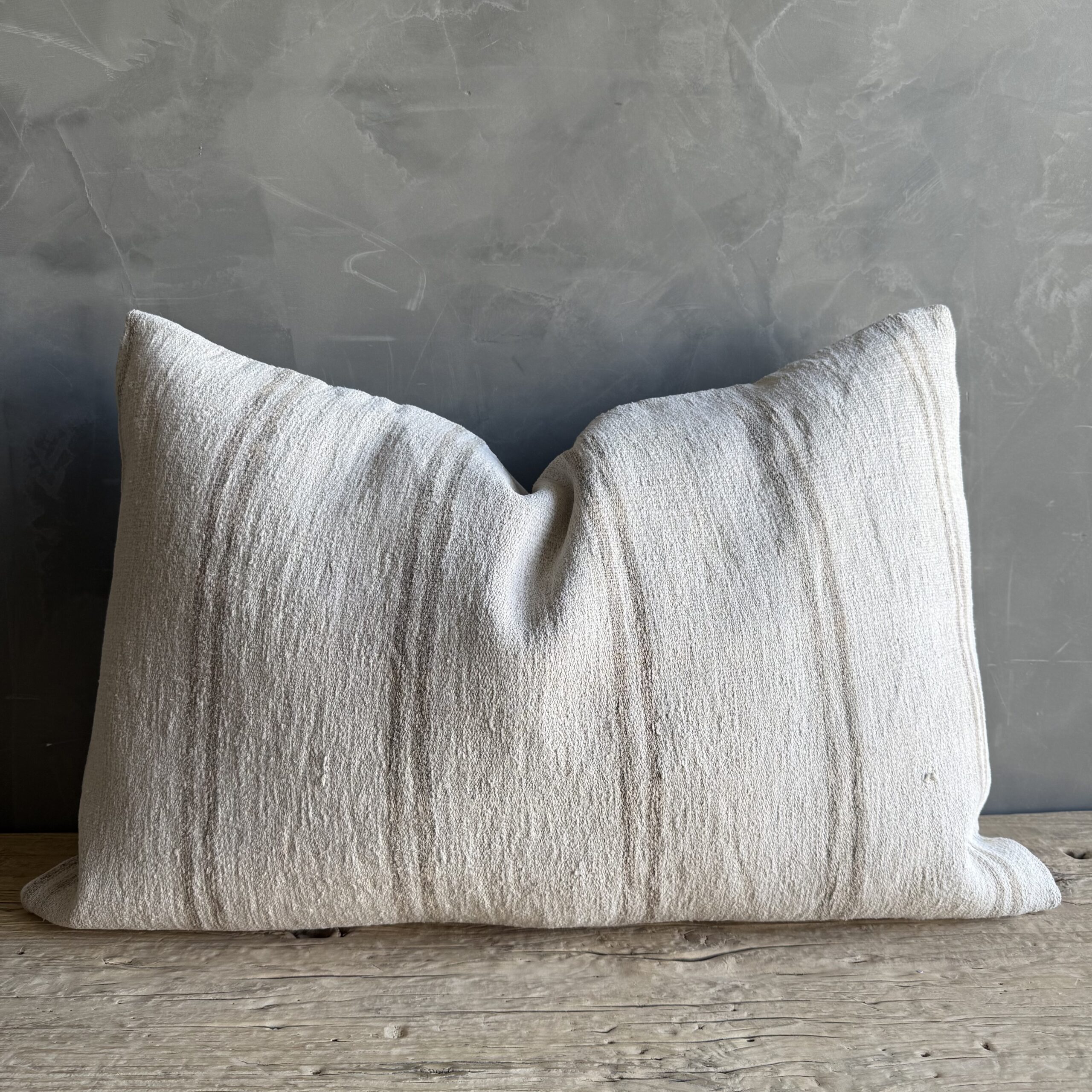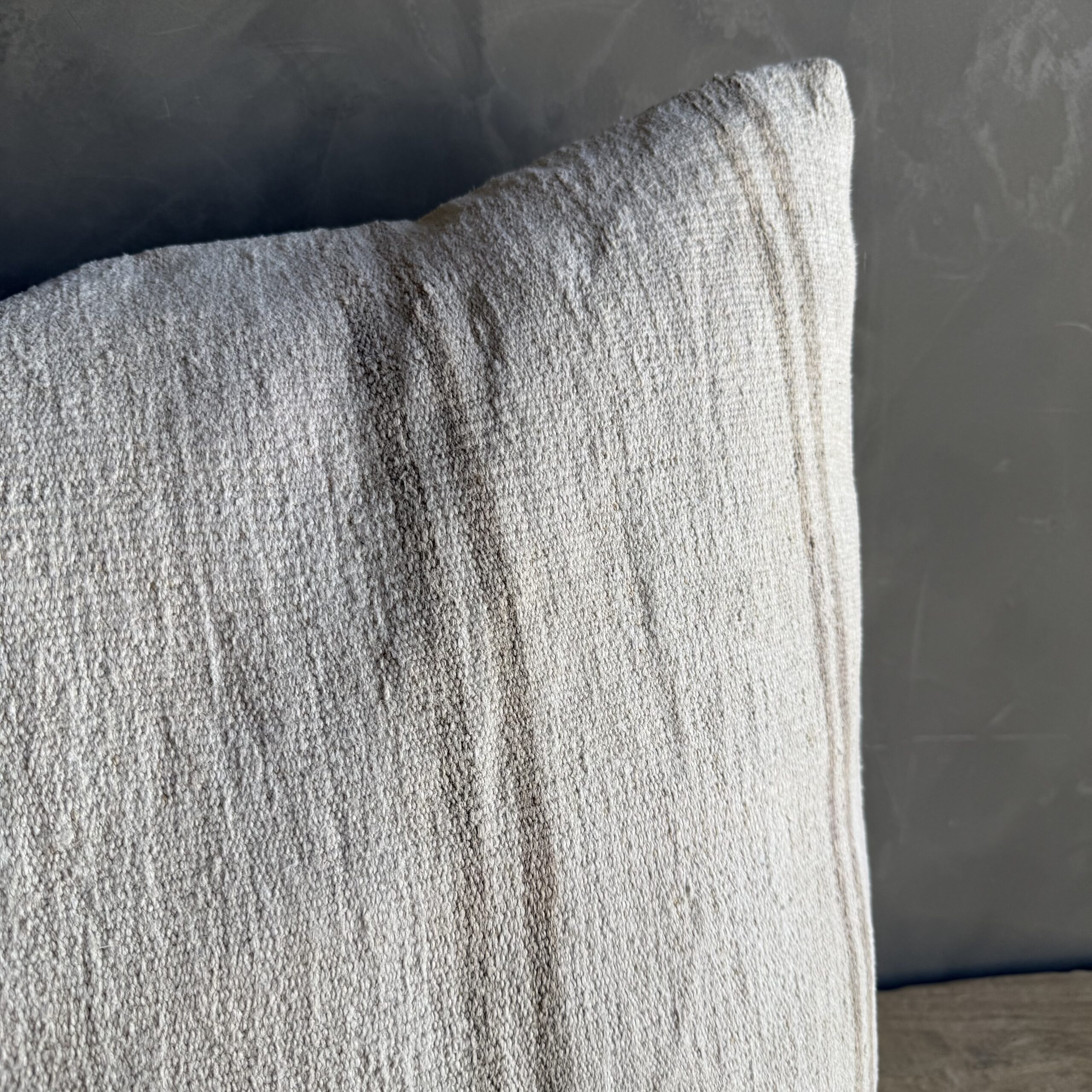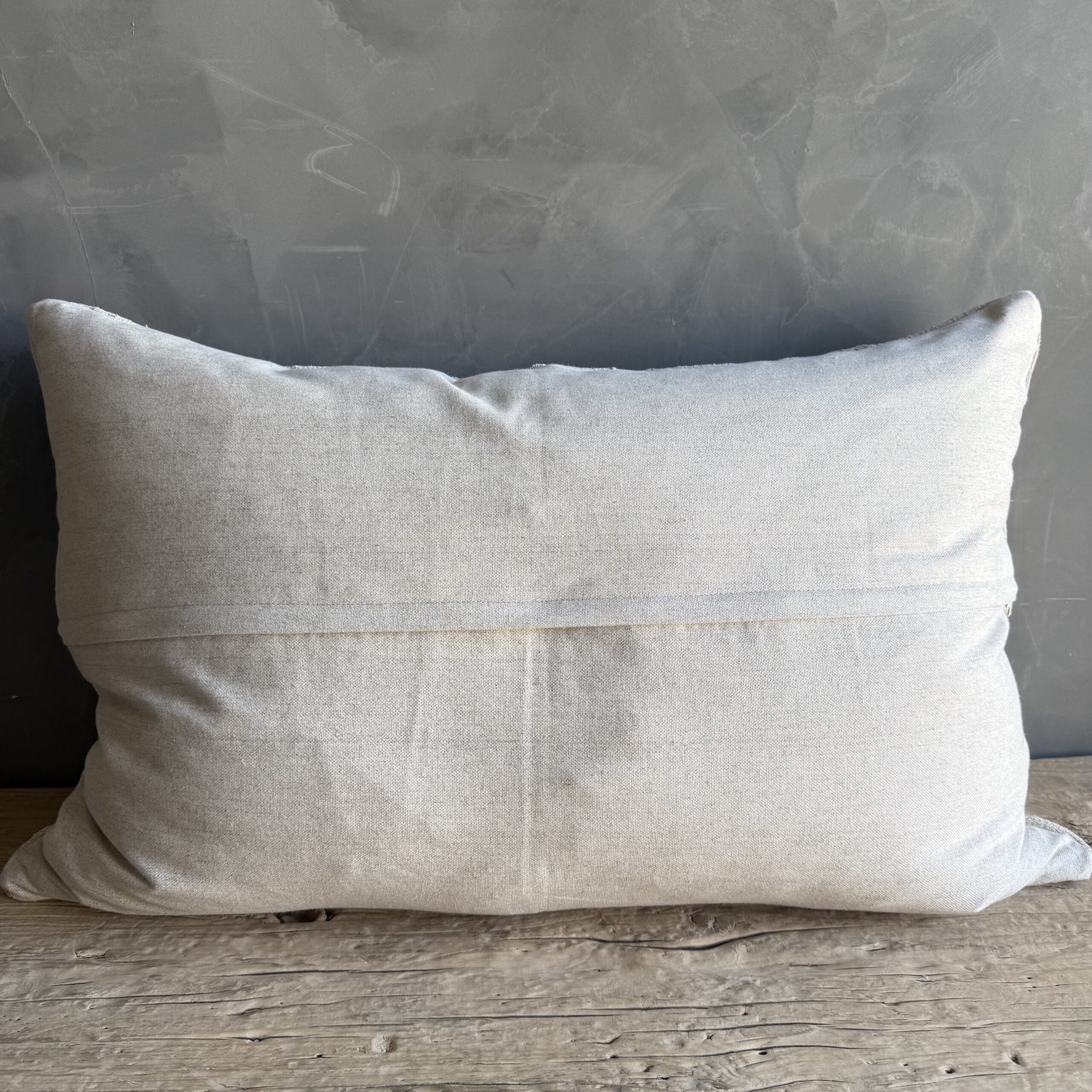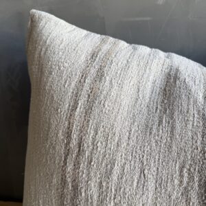 Creamy white hemp rug pillow. Soft hand, linen blend backing with zipper closure. Spot cleaning is recommended, or dry clean. These rugs have been professionally cleaned prior to construction. These durable pillows will last for years, and are great for high use areas.