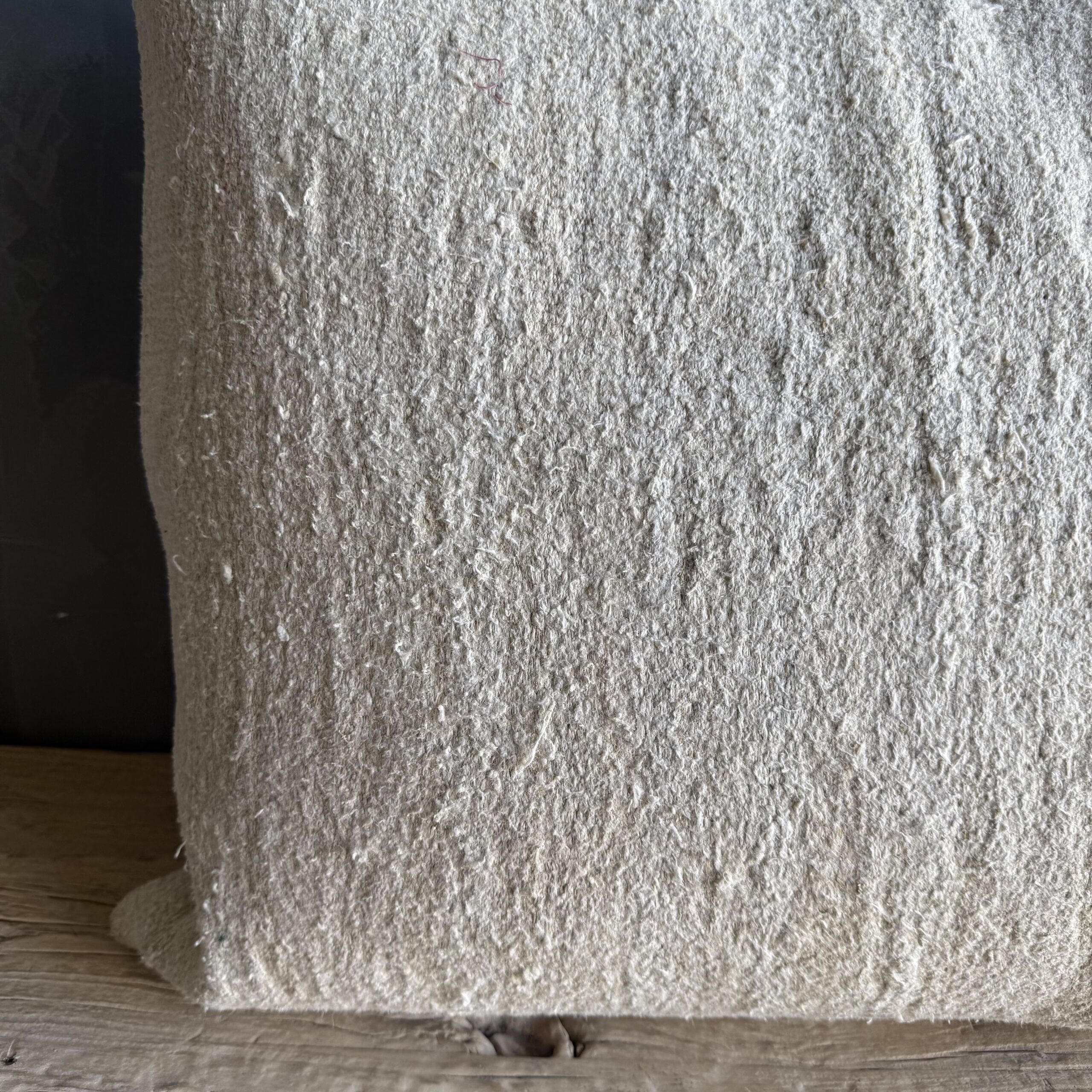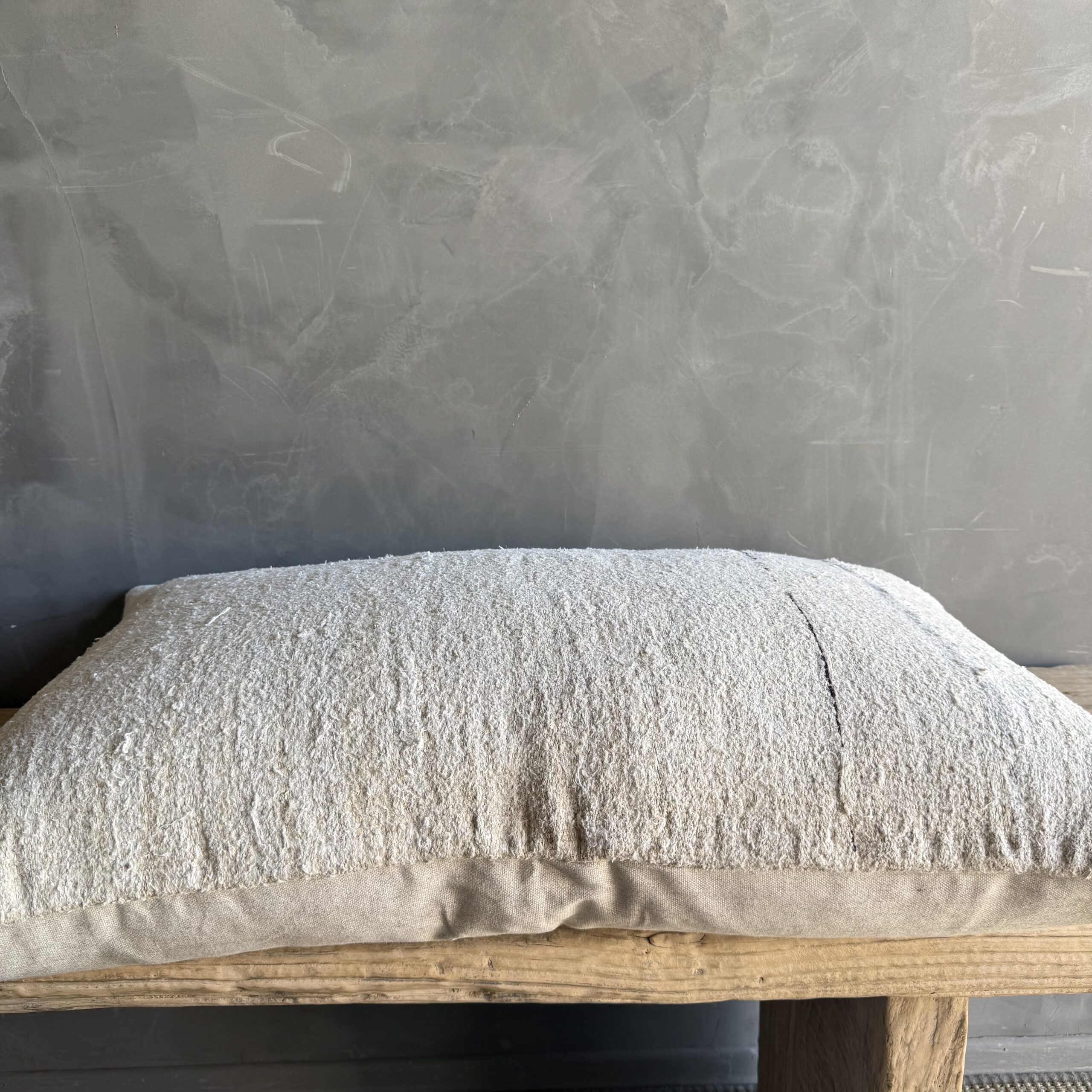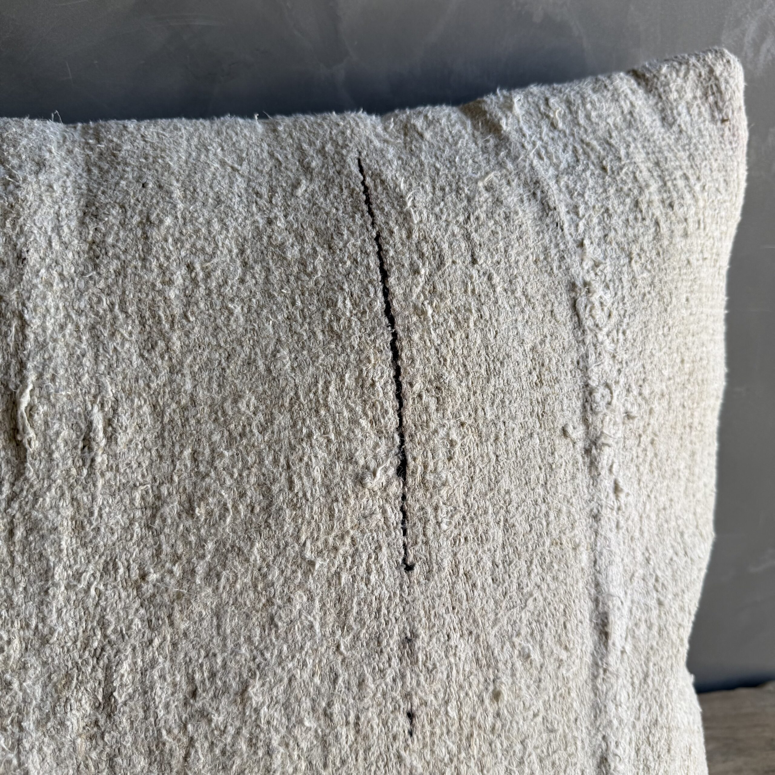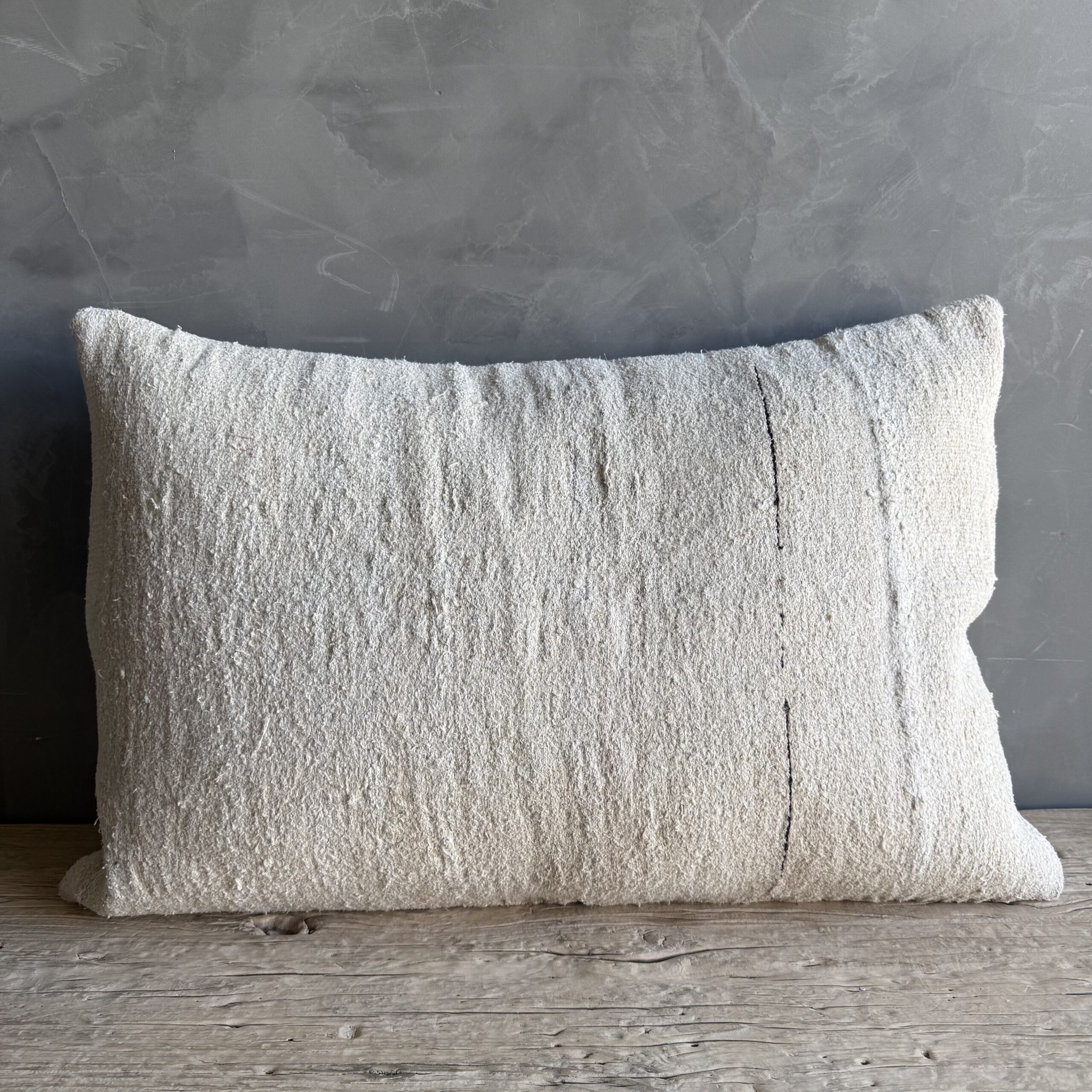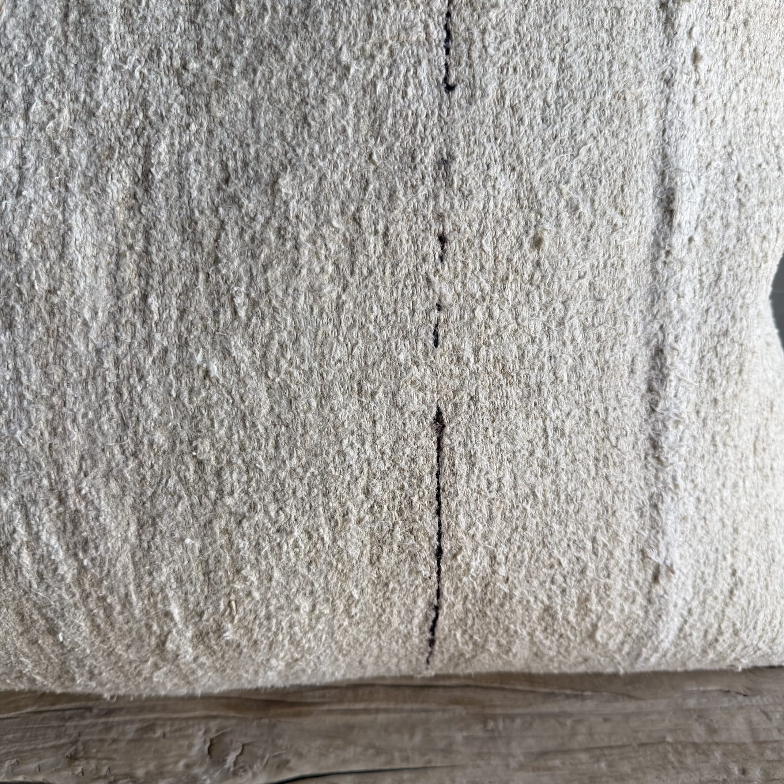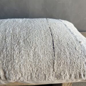 Creamy white hemp rug pillow. Soft hand, linen blend backing with zipper closure. Spot cleaning is recommended, or dry clean. These rugs have been professionally cleaned prior to construction. These durable pillows will last for years, and are great for high use areas.