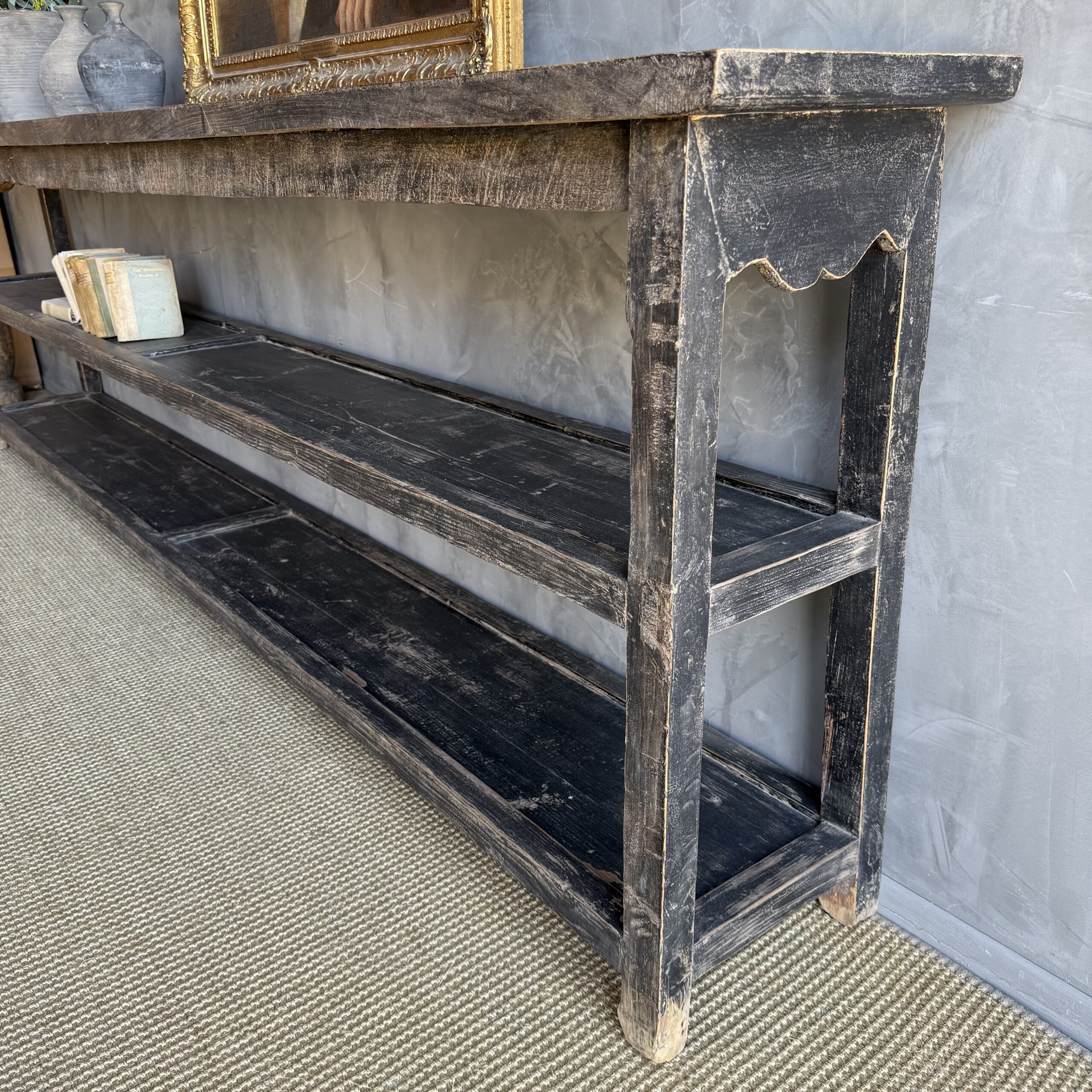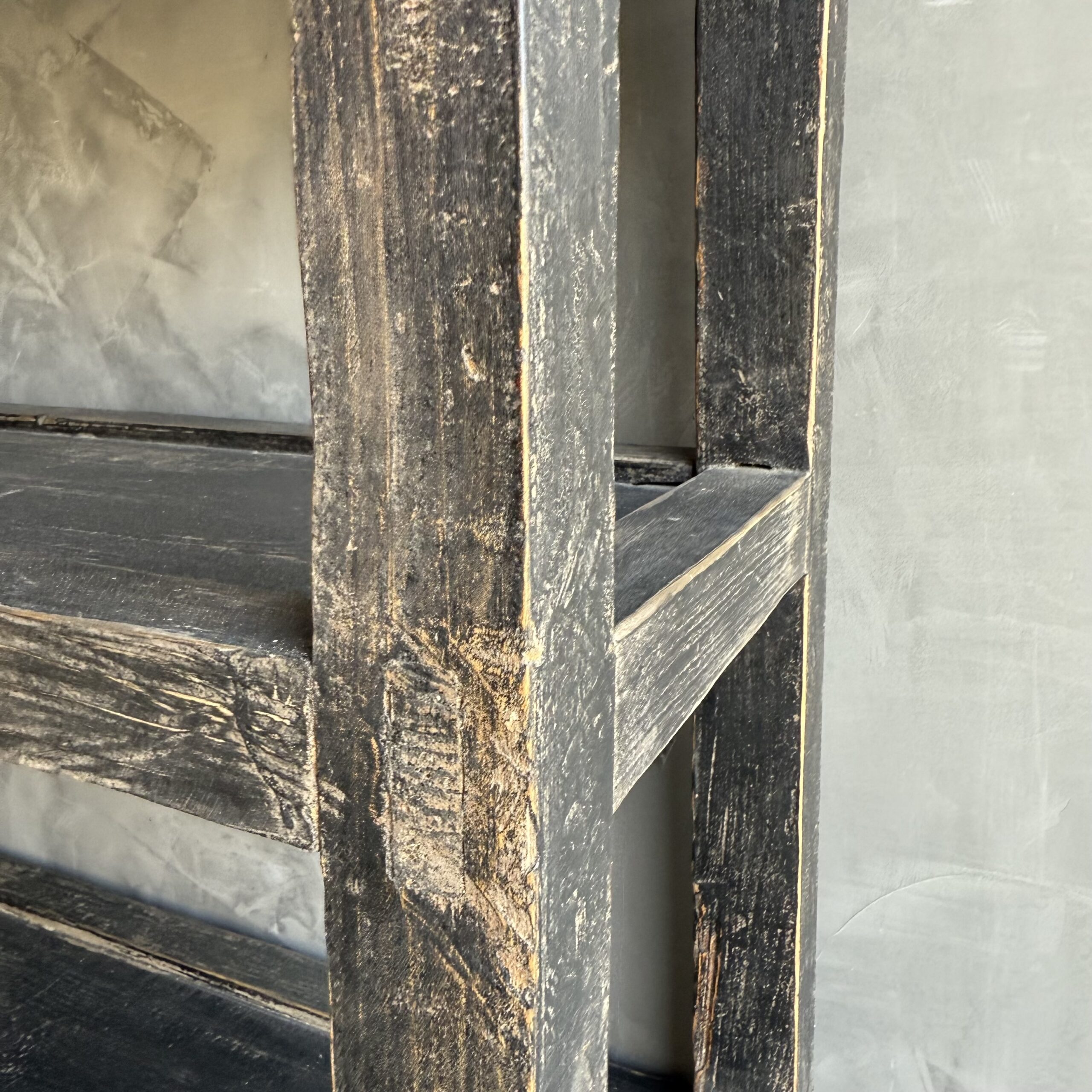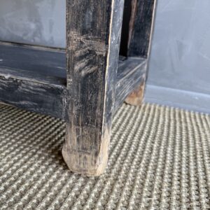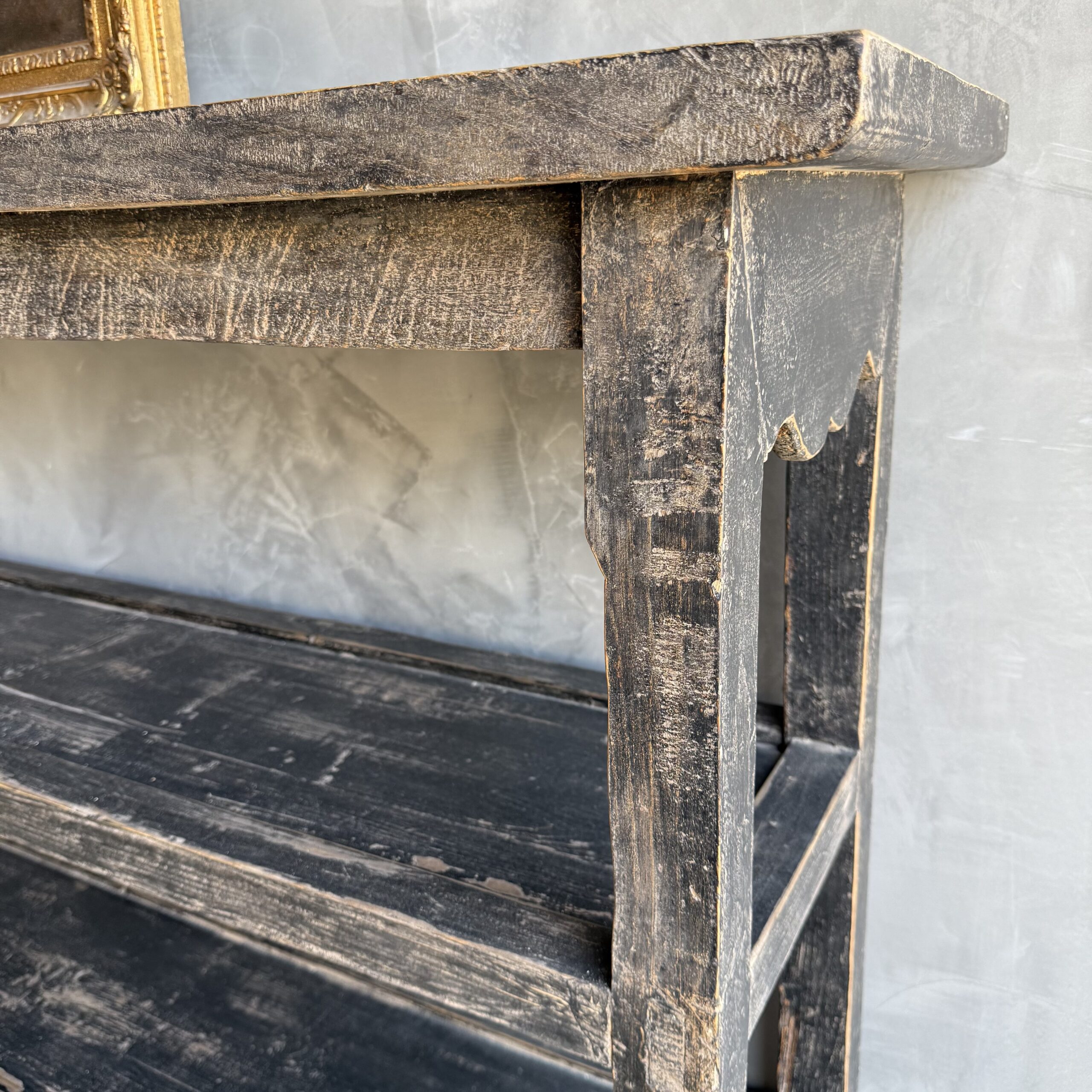 Vintage style elm wood console with faded black painted finish.
