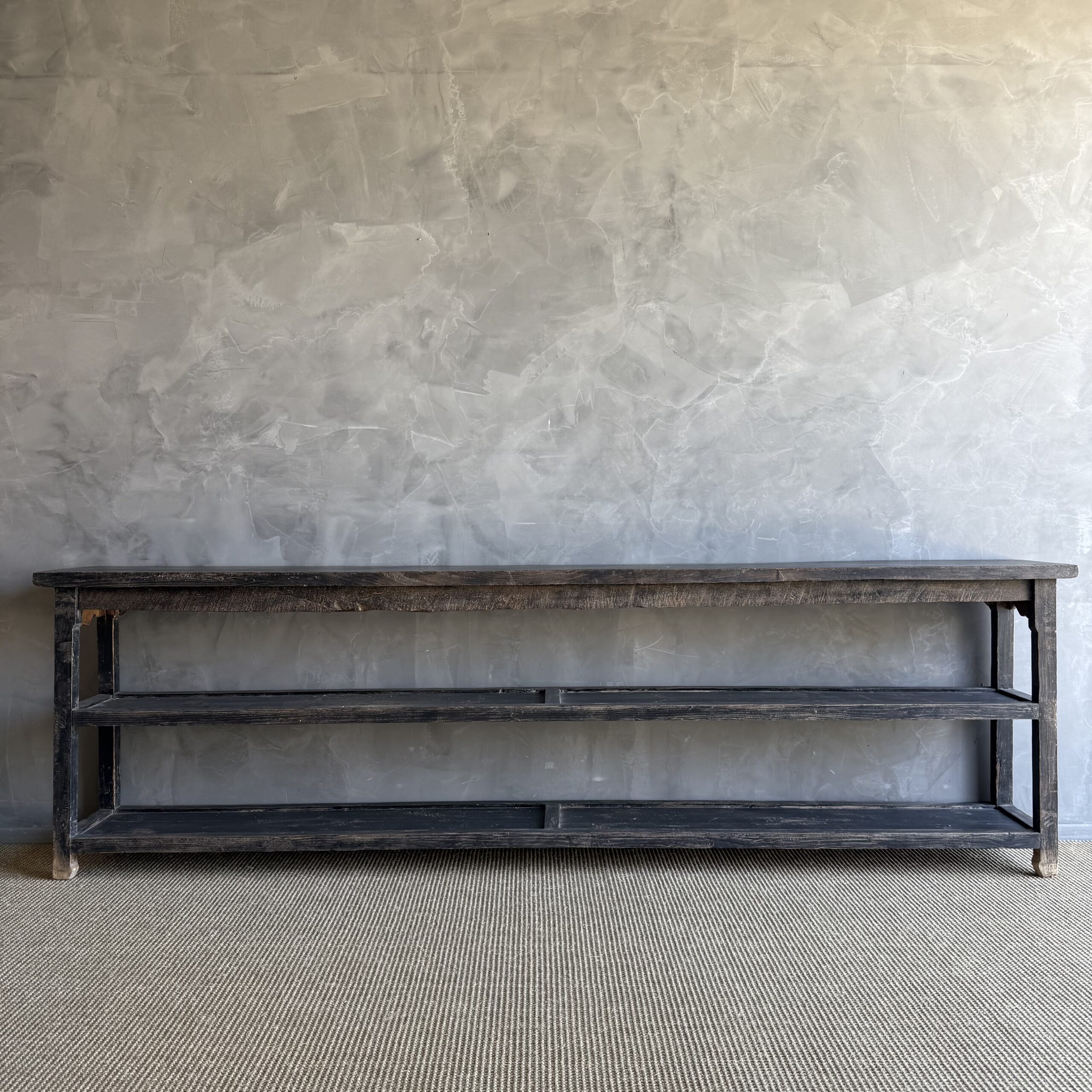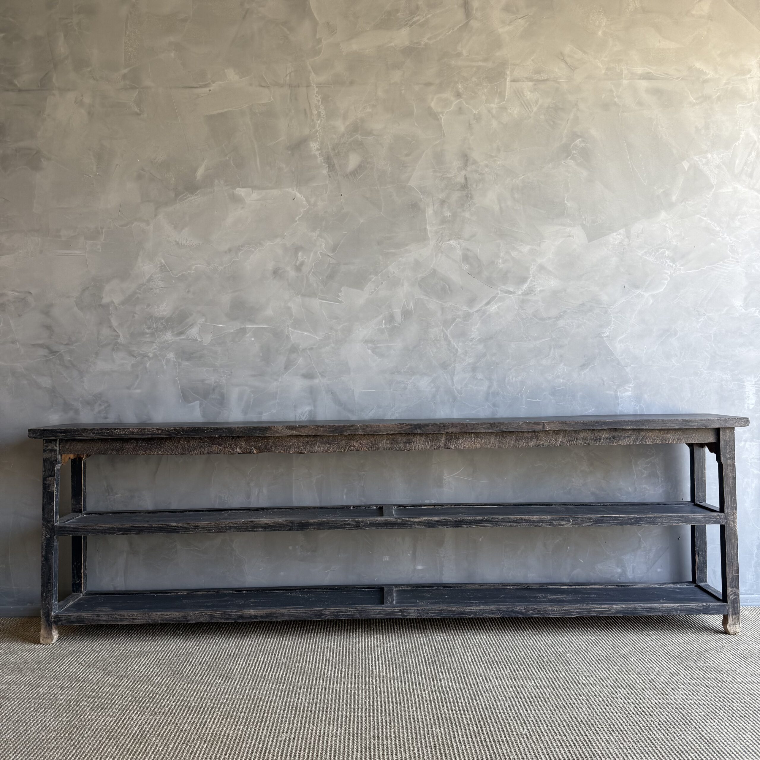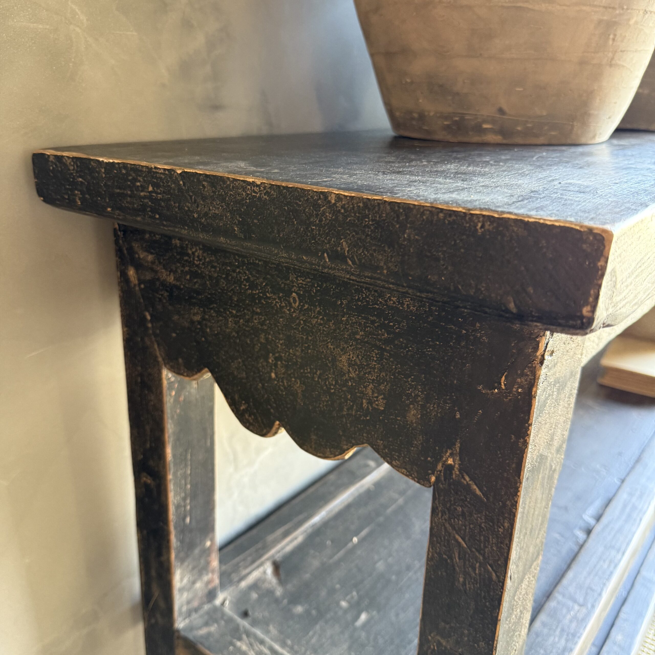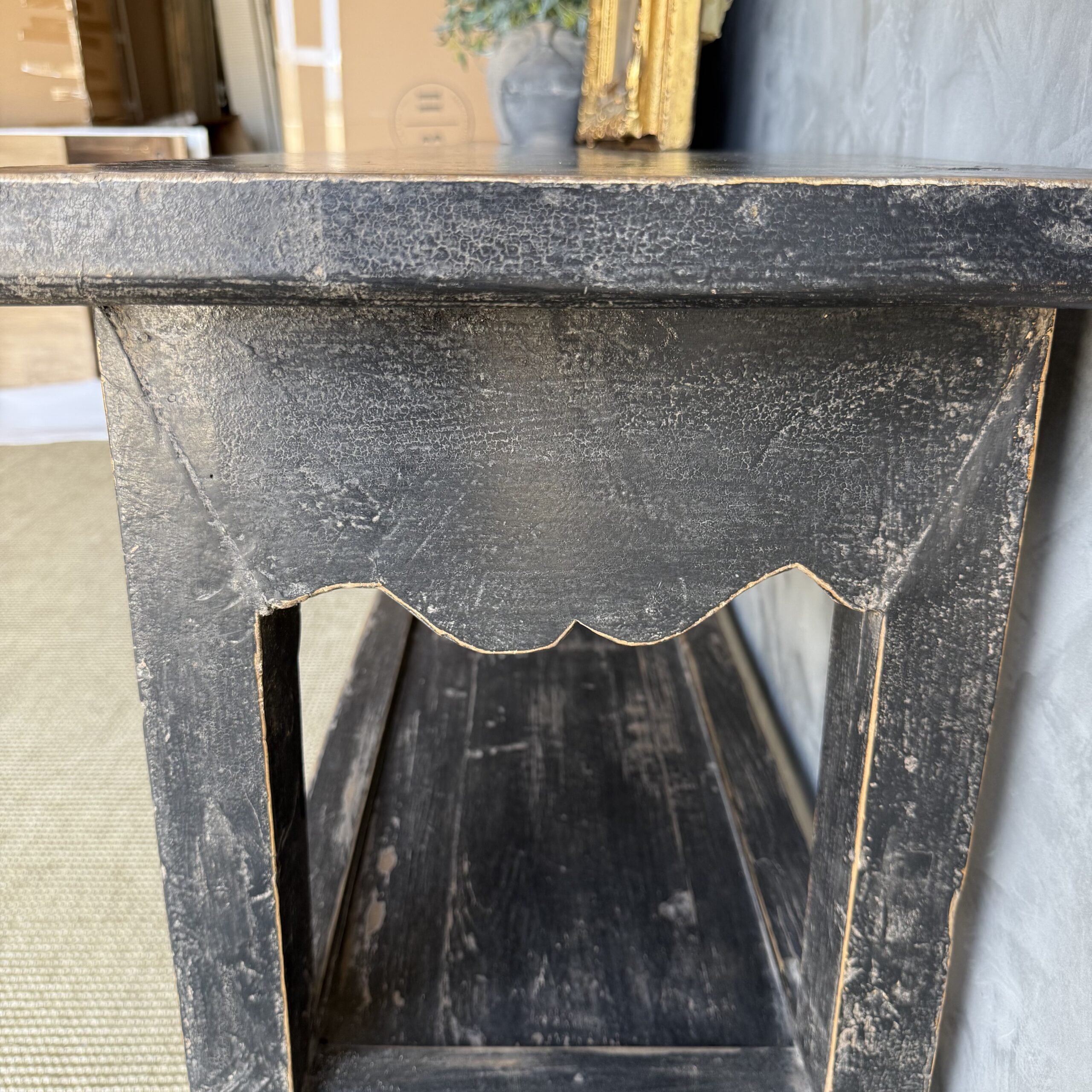 Vintage style elm wood console with faded black painted finish.