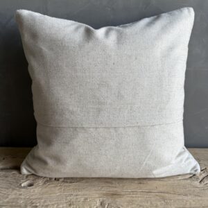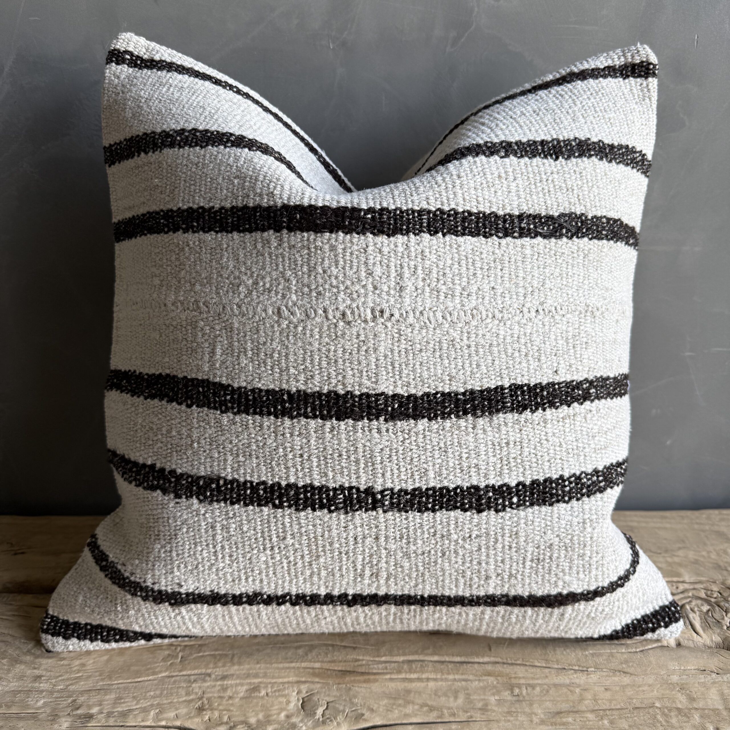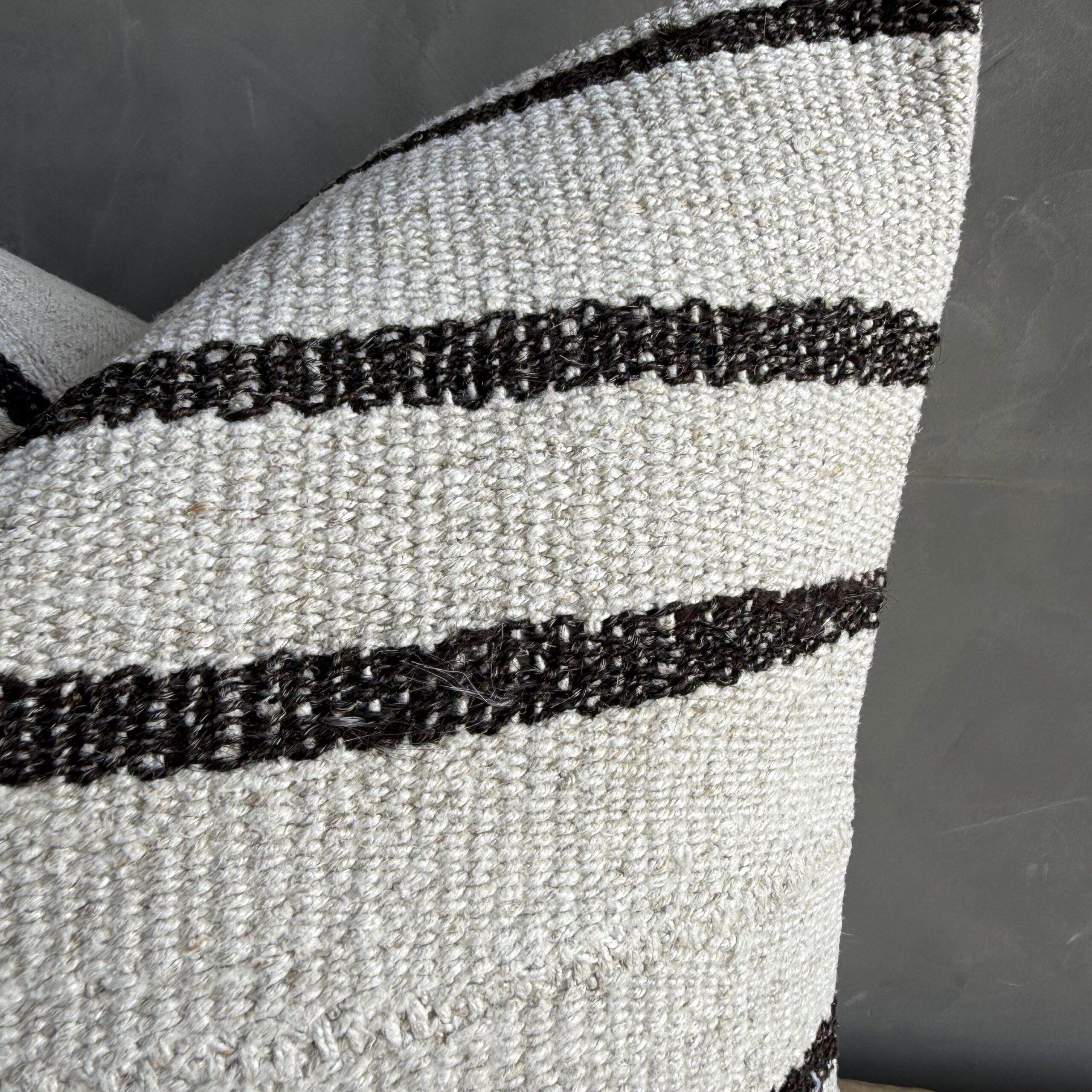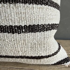 Creamy white hemp rug pillow with stripes. Soft hand, linen blend backing with zipper closure. Spot cleaning is recommended, or dry clean. These rugs have been professionally cleaned prior to construction. These durable pillows will last for years, and are great for high use areas.