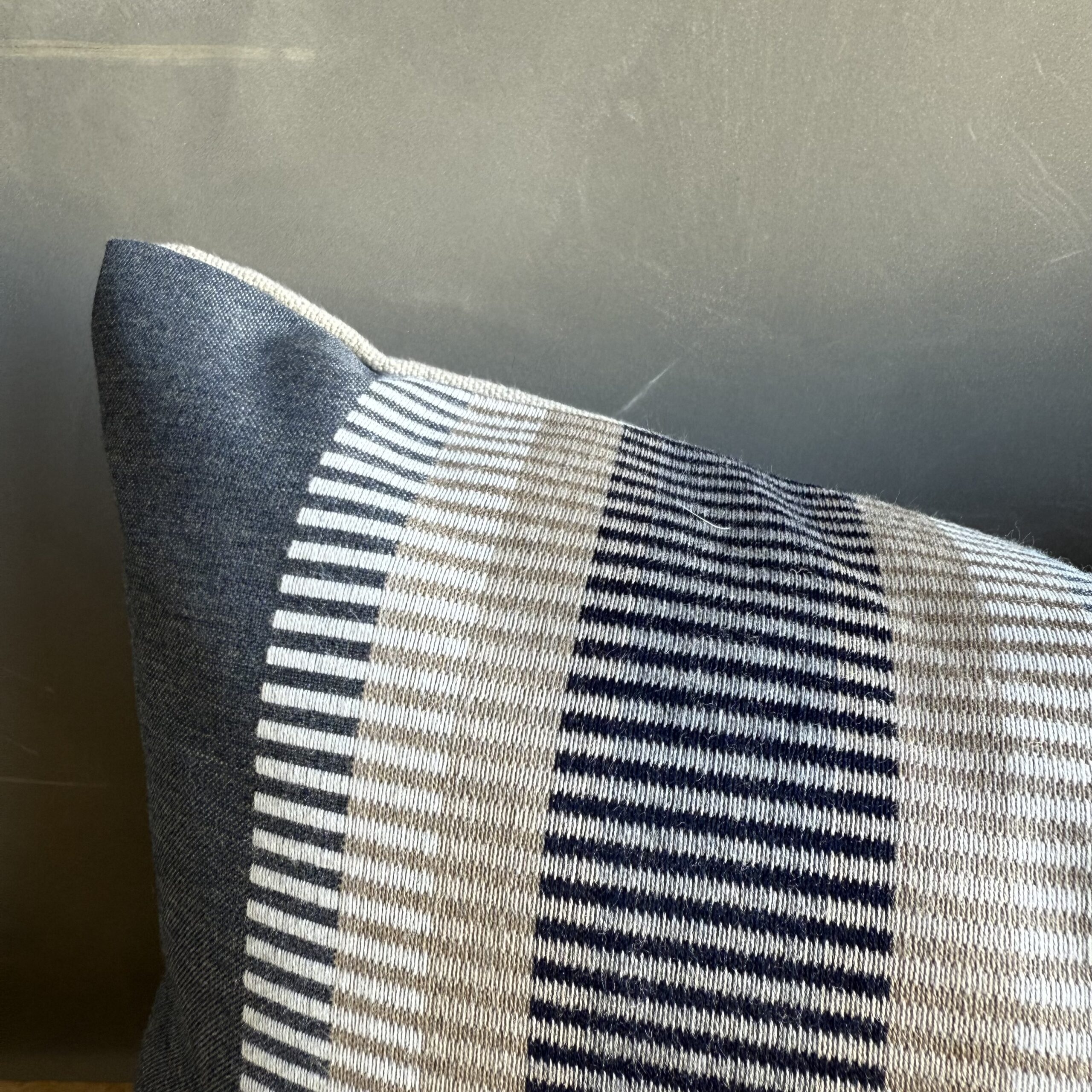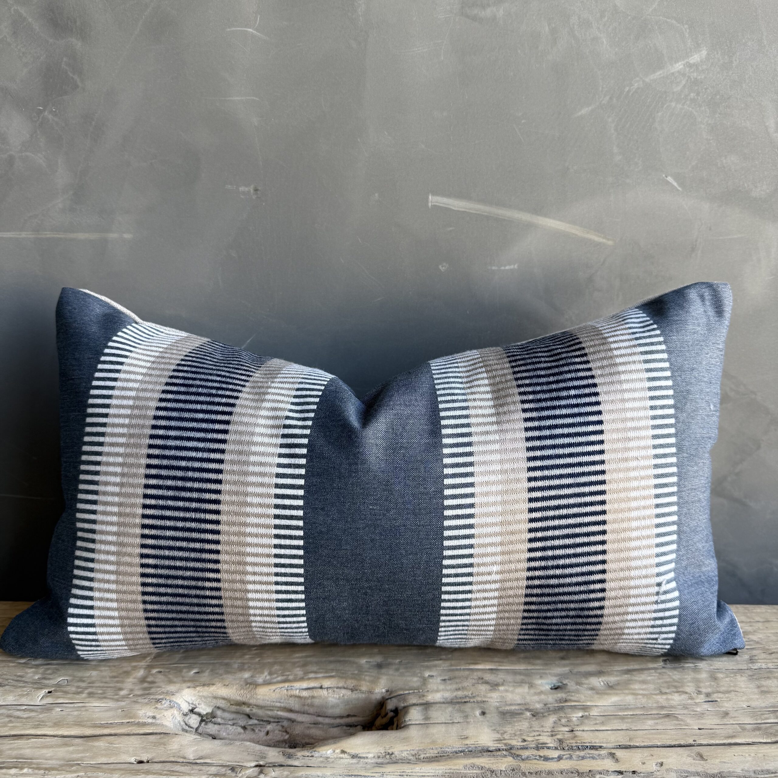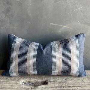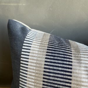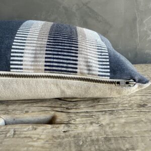 European stripe pillow cover in blue, brown and natural linen. Our pillows are constructed with the finest textiles from around the globe. Carefully constructed with the finest linens, with hidden zipper closure, and over locked seams. Backing: 100% natural linen.